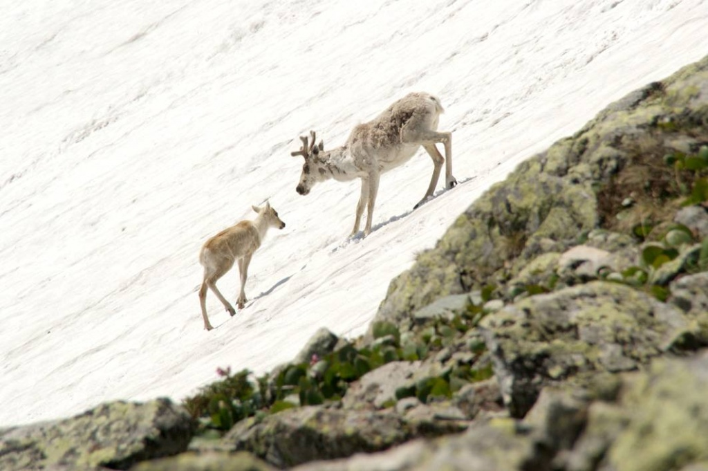 Чтобы помнили -Тихо!- скомандовал Шевалье и сделал круглые глаза, что означало крайнюю степень чрезвычайности. Мужчины сидели на камнях Кузнецкого Алатау, внизу простирался снежник метров пяти в высоту в несколько футбольных полей. Кроме мошки, людей никто есть не собирался, люди замерли и растопырили уши – надо было ловить каждый звук. И они его услышали, вернее, увидели. Внизу на ледник без опаски, уверенно вышел вожак небольшого стада северных оленей. Это, действительно, требовало тишины! Величавые эндемики пришли вместе с детьми. Сразу за главным на снег вступили важенки – оленихи. Очевидно, этот снежник был местом отдыха оленей, где можно было вдохнуть воздуха без густой примеси мошки и таежного гнуса. Своеобразный пляж для рогатых. Они явно расслабились и людей не видели. И не чуяли их. Походники были давно в пути и уже сами пропахли ветром и скалами, почти сливались с местностью, не издавали тревожного запаха людского жилья. Борис Химич, сроднившийся с фотокамерой
