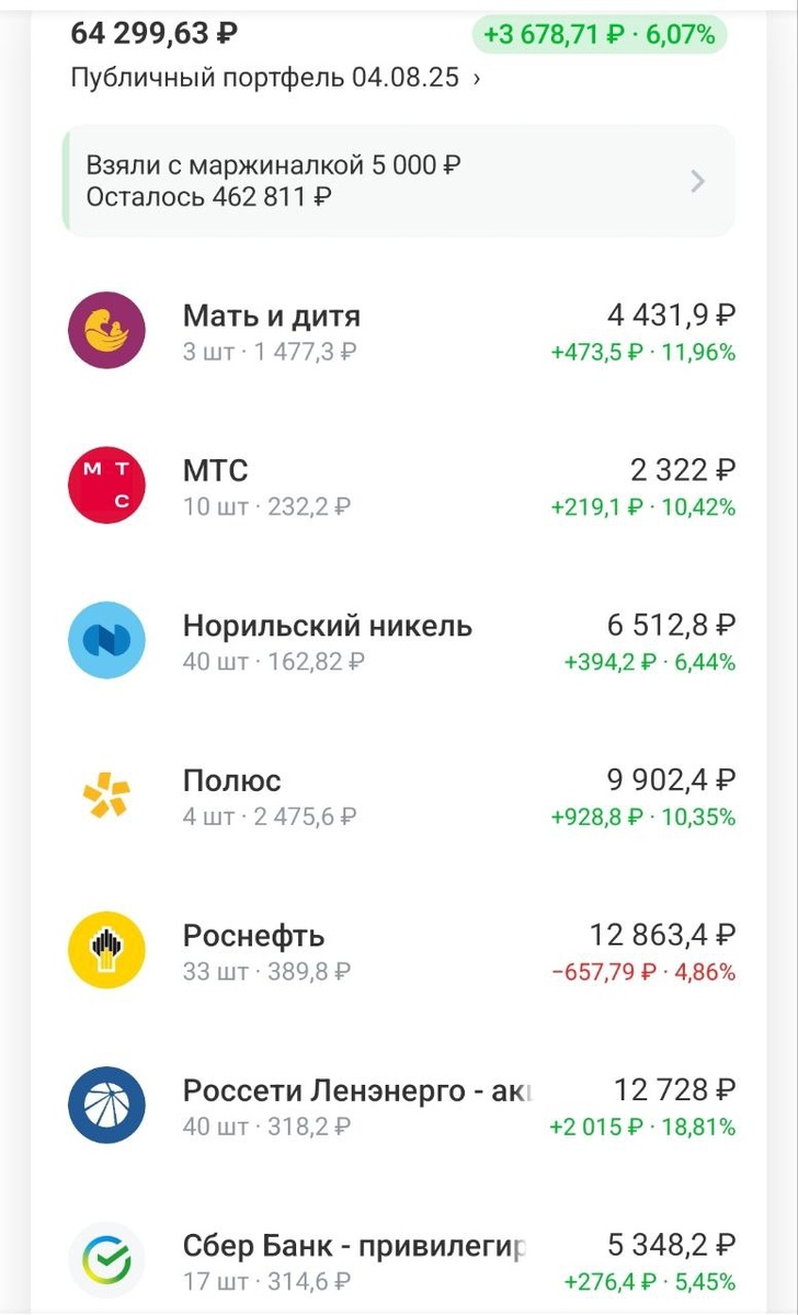 🔥Публичный портфель😁 (Черепахо_Инвестиции) Продолжаем эксперимент, публичный портфель с упором на акции. Распределением и диверсификацируем. Мы идем уверенными шагами! А баланс, почти незаметно превысил 64.000р Я строю долгосрочный инвестиционный портфель. На первый взгляд кажется, что вклады обыгрывают, но, на самом деле это не так. Вклады на год - уже упали до 12% в некоторых банках и падение - продолжается. Важно признать - времена вкладов подходят к концу. В акциях и облигациях можно получить доходность стабильно выше вкладов. По этой причине, именно сейчас я формирую портфель,не только свой, но и публичный! Напомню: Это челлендж, в котором мы делаем еженедельные пополнения и формируем долгосрочный портфель не смотря ни на что. Основная задача - сформировать дисциплину инвестировать. Иксы - не главное (сорвать сейчас в момете). Главное дисциплина и стабильность! Стартовые данные: Начальный капитал - 10.000р Пополнения - 2500 в неделю, либо кратно покупке +/-100/300р Стре