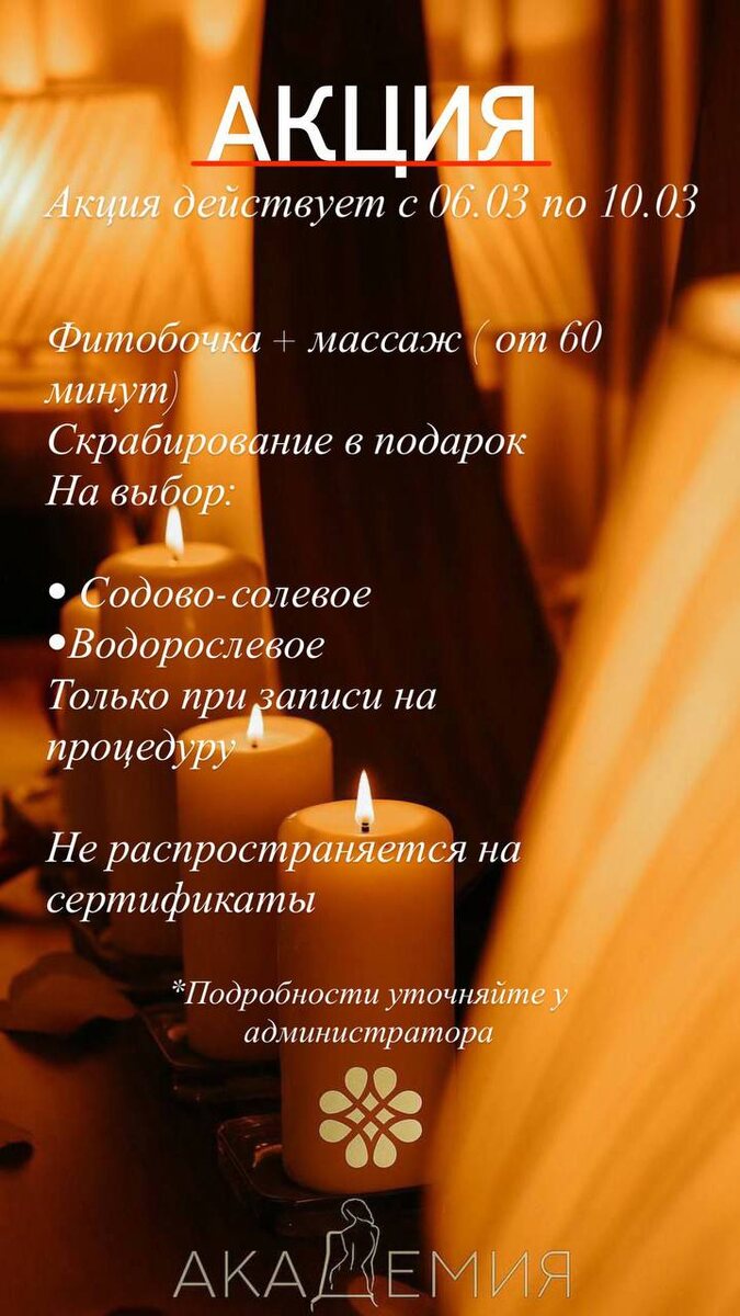 🌿 Специальная акция к 8 Марта в студии массажа «Академия тела» Пора просыпаться вместе с природой — мягко, тепло и с заботой о себе 🤍 Мы подготовили для вас особенный весенний ритуал: ✨ Фитобочка ✨ Массаж от 60 минут 🎁 Скрабирование в подарок При записи на фитобочку + массаж (от 60 минут)— скрабирование в подарок. Акция действует только при живой записи на процедуру и не распространяется на подарочные сертификаты. Вы можете выбрать скрабирование: 🌿 Содово-солевое — для глубокого очищения и гладкости кожи 🌊 Водорослевое — для тонуса, упругости и детокс-эффекта 💫 Стоимость по акции — 3100₽ вместо 3750₽ (при часовом расслабляющем массаже) 📅 Предложение действует при записи на даты с 6.03 по 10.03 Подарите себе лёгкость, обновление и ощущение весны в теле 🌷 Количество мест ограничено — записывайтесь заранее. Студия массажа «Академия тела» 🌿 Чтобы подобрать подходящую программу под ваши запросы, администраторы помогут вам в Телеграмм или по тел.: 89143641717 Наш сайт AK