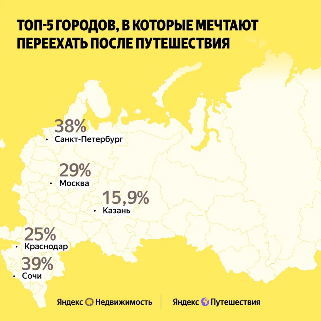 89% опрошенных россиян после визита в другой город хотели бы остаться там подольше. Половина респондентов рассматривает вариант пожить в новом месте какое-то время, а 40% заявили, что готовы переехать навсегда. Об этом «Краснодарским известиям» рассказали в пресс-службе Яндекс Недвижимости. Краснодар вошел в пятерку городов, которые чаще всего вдохновляют на смену места жительства после путешествия. О желании переехать сюда сообщили 25% участников опроса. Чаще всего россияне задумываются о переезде после поездок в Сочи (39%), Санкт-Петербург (38%), Москву (29%) и Казань (15,9%). Аналитика Яндекс Путешествий показывает, что Краснодар привлекает в основном жителей Москвы и Московской области — на них приходится 11% бронирований. Также сюда активно едут туристы из Ростова-на-Дону (8%) и Ставрополя (3%). Причины для возможного переезда разнообразны. 70% опрошенных называют главным фактором природу, 45% — местную культуру, 38% — менталитет жителей. Треть путешественников отмечает кухню, каж