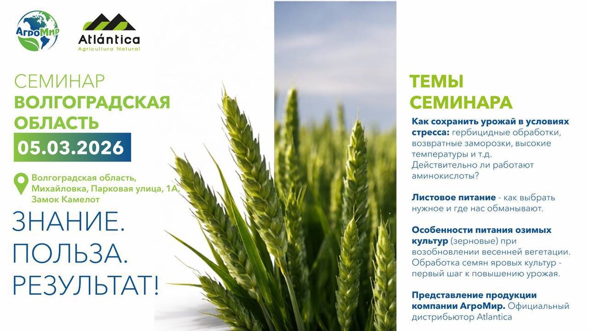 Волгоградская область Уже совсем скоро встречаемся в Михайловке! 5 марта 2026 года приглашаем аграриев Волгоградской области на практический семинар от АгроМир. Поговорим о реальных проблемах и рабочих инструментах, которые помогают сохранить и приумножить урожай. 📍 Место проведения: Волгоградская область, г. Михайловка, ул. Парковая, 1А Замок Камелот 📅 Дата: 05.03.2026 В программе: • Как сохранить урожай в условиях стресса: гербицидные обработки, возвратные заморозки, высокие температуры • Работают ли аминокислоты на практике • Листовое питание: как выбрать правильно и где скрываются ошибки • Особенности питания озимых зерновых при возобновлении весенней вегетации • Обработка семян яровых культур — как заложить фундамент урожайности • Презентация продукции АгроМир — официальный дистрибьютор Atlantica в РФ Если вы планируете сезон 2026 с расчетом на результат — обязательно приезжайте! 📲 Предварительная регистрация: Елена +7 928 968 7477 Ждем вас. Будет полезно. 🌾