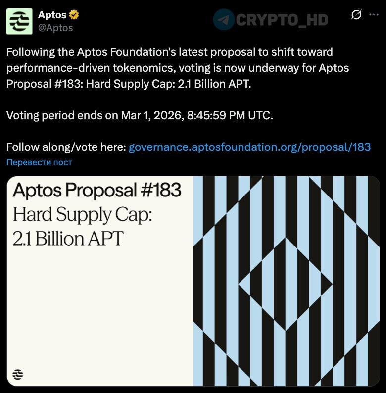 🥳 В Aptos предлагают ограничить максимальную эмиссию #APT до 2,1b токенов – голосование завершится 1 марта.