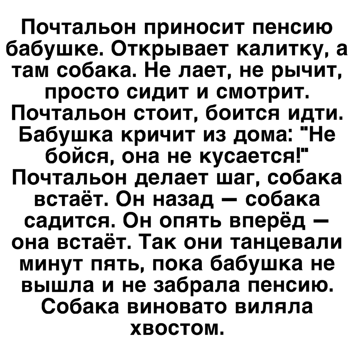 Почтальон приносит пенсию бабушке. Открывает калитку, а там собака. Не лает, не рычит, просто сидит и смотрит. Почтальон стоит, боится идти. Бабушка кричит из дома: "Не бойся, она не кусается!" Почтальон делает шаг, собака встаёт. Он назад — собака садится. Он опять вперёд — она встаёт. Так они танцевали минут пять, пока бабушка не вышла и не забрала пенсию. Собака виновато виляла хвостом.