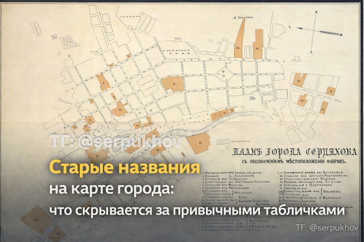 Старые названия на карте города: что скрывается за привычными табличками Про улицу Ворошилова знают почти все: до советского переименования она была Дворянской, но у неё есть ещё один слой истории. 📍Дорога к железнодорожной станции 1867 года называлась Александровской. В 1887 году название утвердили в память об Александр II. В 1920-е улица стала Вокзальной, а в 1938 году после объединения с Дворянской появилась единая улица Ворошилова. Окончательно это закрепили решением горисполкома 7 января 1970 года. 😮 Есть и названия из средневекового Серпухова: Красная гора, Нижняя Серпейка, Верхние Гончары. Гончарная тема вообще не случайна — ремесло известно здесь с сотной книги 1552 года. ➡ Отдельная важная точка старого Серпухова — торговля. В документах встречается Старый базар: место между Ильинской и Успенской церквями. Купцы долго держались за него по привычке, и торг переносился на Главную площадь постепенно, ближе к 1800 году. Даже нынешний Шуруповский мост в дореволюционные годы н