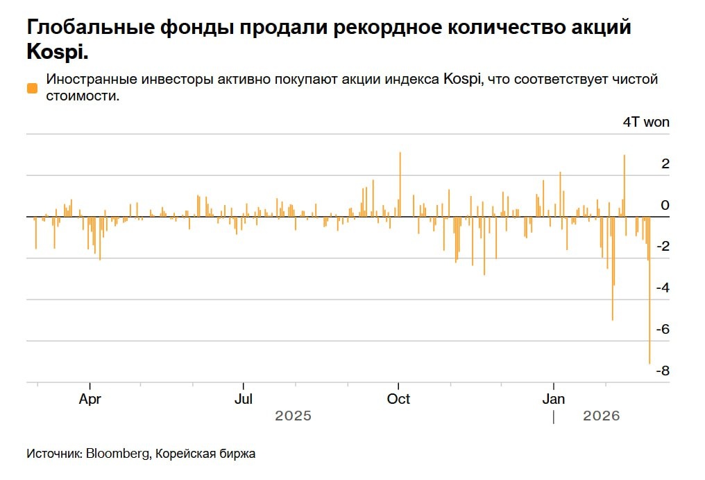 Обвал полупроводников = обвал Азии = маржин-коллы глобальных хедж фондов А так все нормально Согласно данным Корейской биржи, иностранные фонды продали акции индекса Kospi на сумму 6,8 триллиона вон (4,7 миллиарда долларов) в ходе основной торговой сессии. Индекс Kospi упал на 1%, прервав шестидневную серию роста Местные институциональные и розничные инвесторы, тем временем, были чистыми покупателями https://www.bloomberg.com/news/articles/2026-02-27/global-funds-dump-nearly-5-billion-of-korean-stocks-after-rally Ведущие мировые управляющие активами отдают предпочтение развивающимся рынкам, сообщает Citi Азиатские технологические акции проигнорировали панику, охватившую Уолл-стрит на этой неделе после публикации отчета, предполагающего, что искусственный интеллект нарушит работу значительной части экономики. Это связано с тем, что корейские и тайваньские компании производят оборудование, используемое для создания сетей ИИ Южнокорейские акции выросли еще на 3,8% в четверг, при эт