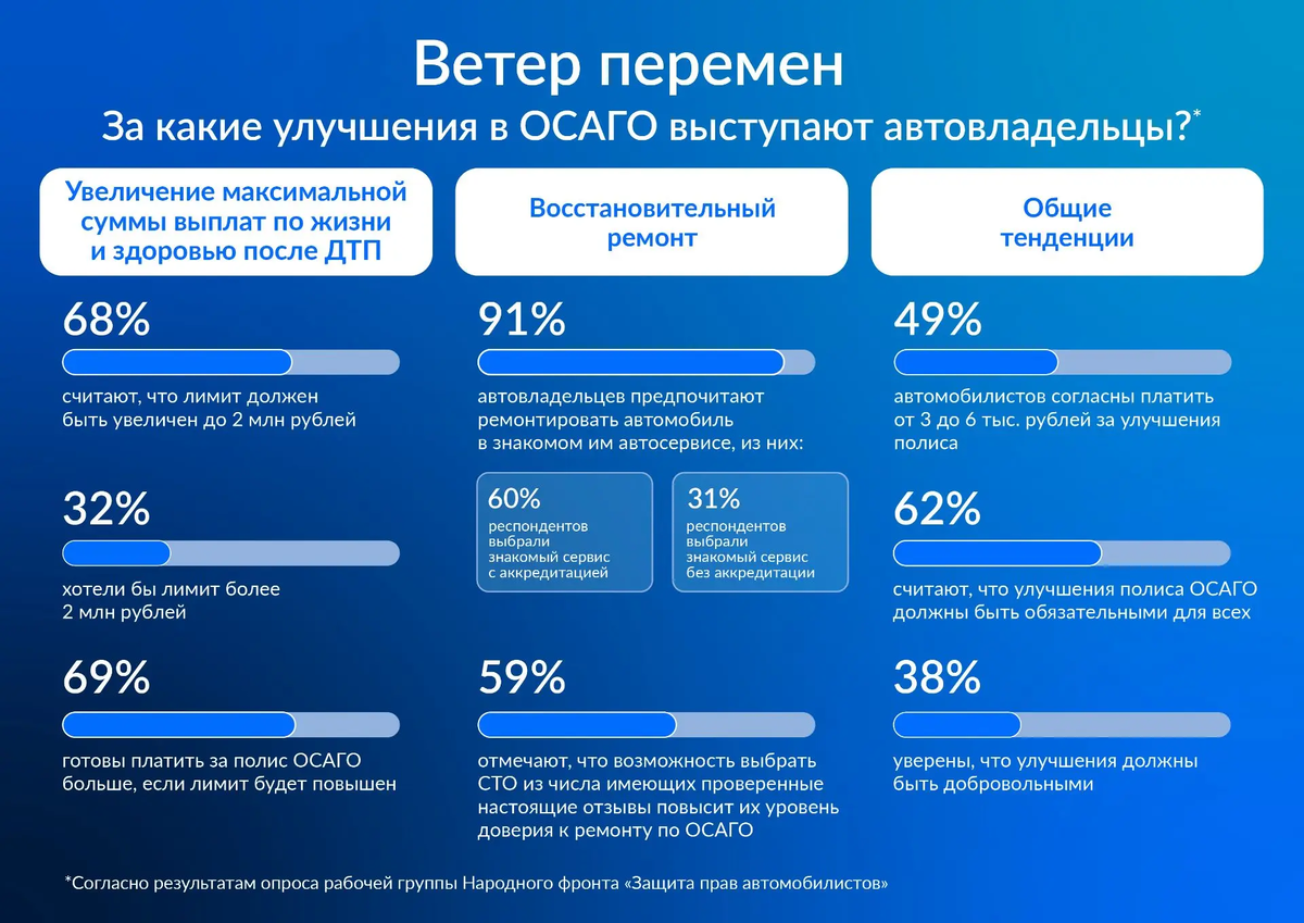 Татьяна Автомаркетолог Акимова (13:52): ОСАГО без иллюзий: водители готовы платить, но хотят контролировать ремонт Опрос автомобилистов, проведенный рабочей группой Народного фронта «Защита прав автомобилистов», показал: 84% респондентов поддерживают увеличение лимита выплат по жизни и здоровью. При этом 68% считают разумным порог в 2 млн рублей, еще 32% - более 2 млн рублей. Но важно и другое: 69% готовы доплатить за полис, если получат более высокую защиту. Вопрос натурального возмещения также получает поддержку большинства. Но свобода выбора сервиса стала важным критерием выбора для 91% опрошенных, которые предпочли бы ремонтировать автомобиль в знакомом СТО. Из них 60% выберут сервис при наличии официальной аккредитации, а 31% готовы довериться знакомой станции даже без формального статуса. 59% отмечают, что наличие проверенных отзывов повышает доверие к ремонту по ОСАГО. Исследование фиксирует системную проблему. Она заключается в том, что незнакомые автосервисы вызывают высокий у