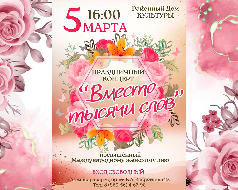 Дом культуры Семикаракорского района открывает двери для всех желающих посетить праздничное мероприятие, приуроченное к Международному женскому дню. Концерт получил название «Вместо тысячи слов». Посетить торжество можно абсолютно бесплатно. Начало 5 марта, в 16.00. Подарите своим любимым прекрасное настроение и великолепный музыкальный вечер! Читайте нас в MAX