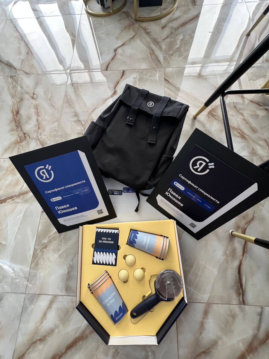 Беру трубку, вам доставка от Major express. Сначала подумал что ошиблись. Потом вспомнил что указывал свой адрес для получения плюшек от Яндекса. Настолка «Что-то на офисном», рюкзак, 2 наклейки, печатные сертификаты, которые получил за прохождение тестирования по контекстной рекламе Яндекс Директ «профессиональный» и «продвинутый» уровень. В целом, приятно, если не брать в расчет нынешнюю политику Яндекса и её работу для рекламодателей.