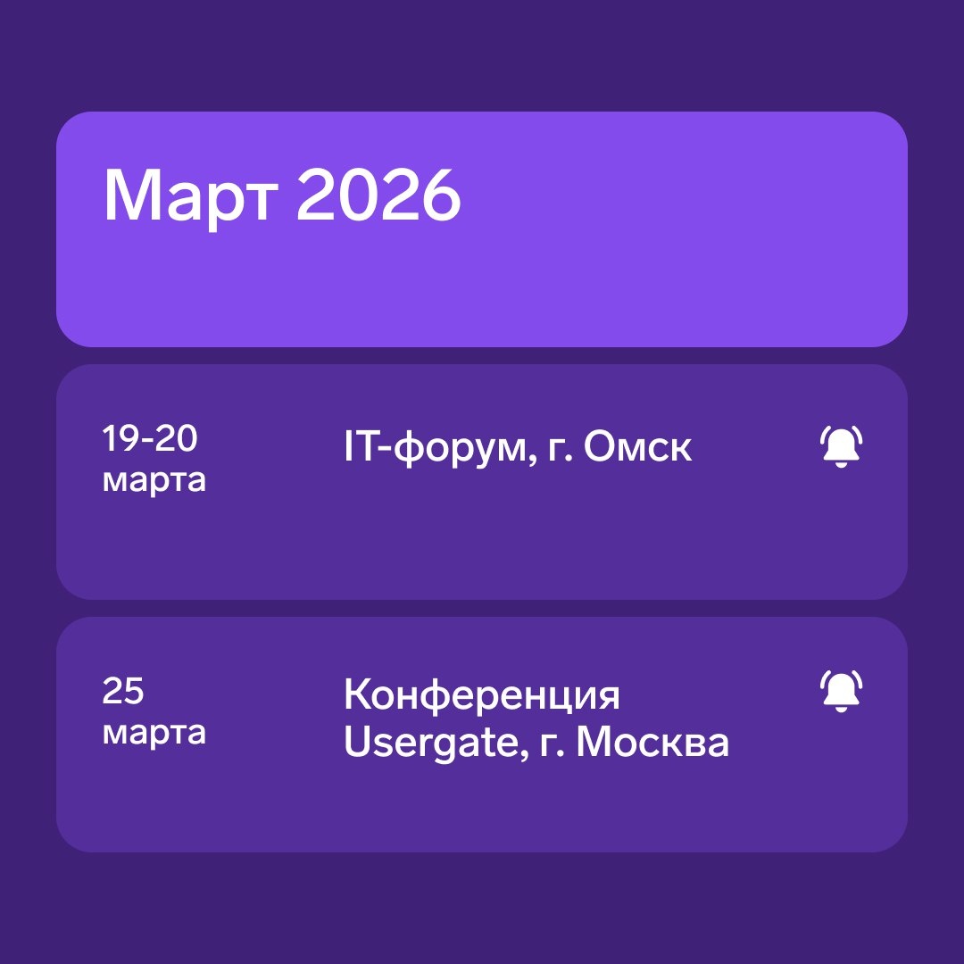 ▪️ IT-форум — 19–20 марта Уже более 10 лет ИТ-форум регулярно собирает ключевых представителей ИТ-отрасли, создавая пространство для обмена опытом и обсуждения вопросов цифровой трансформации в бизнесе, промышленности, образовании и госуправлении 📍Омск ▪️ Конференция Usergate — 25 марта Конференция про построение архитектуры сетевого доверия. 📍Москва
