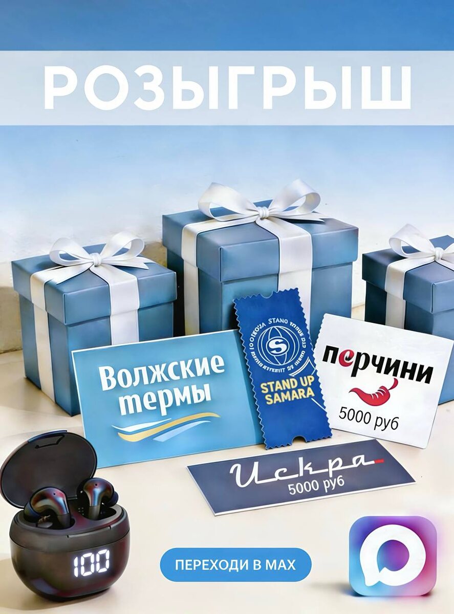 🎁 ⚡️ В связи с блокировкой телеграмм 1 апреля, мы решили дублировать информацию в MAX, чтобы всегда оставаться на связи с вами, даже в случае блокировки! 🎁 Дарим вам: 1. Сертификат в Перчини на 5000₽ 2. Сертификат в Волжский термы 3. Сертификат в ресторан «Искра» на 5000₽ 4. 2 билета на стендап Леонида Кулакова 5. Беспроводные наушники SK18 ❗️Условия просты: Подписка на MAX и нажмите там участвую! 💡За каждого приглашенного друга Вы кратно увеличиваете шанс на победу: +1 друг = +1 дополнительный билет! Уже 6 марта мы узнаем победителей! Желаем всем удачи🍀