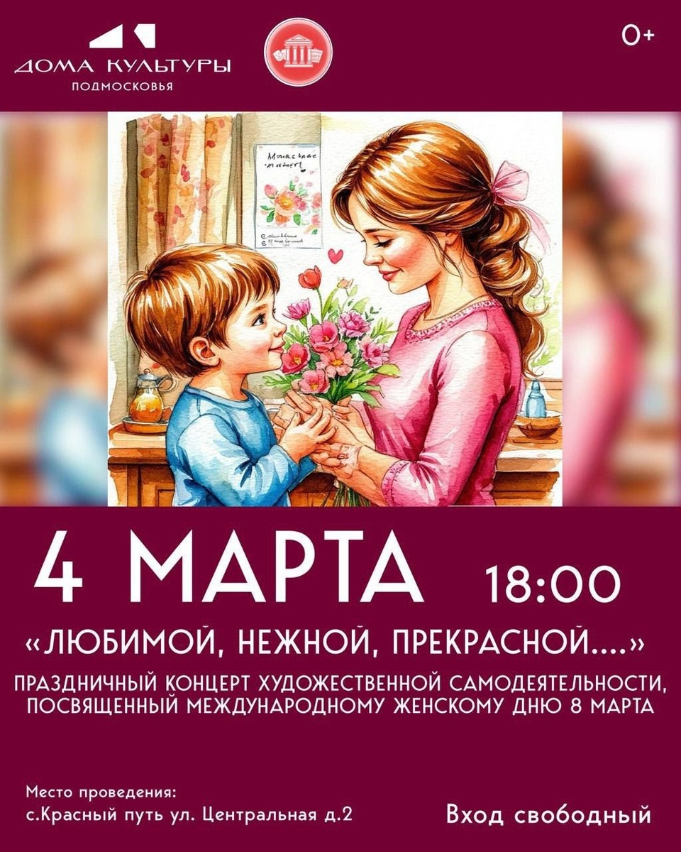 ✨ СДК «Русь» приглашает 🌸🌸🌸🌸🌸🌸🌸🌸🌸 «Любимой, нежной , прекрасной…» - концерт в преддверии главного праздника весны - Международного женского дня - 8 Марта 🌷🌷🌷🌷🌷🌷🌷🌷🌷 Вас ждёт большая праздничная программа художественной самодеятельности СДК «Русь» Приходите, мы подарим Вам весеннее настроение и яркие моменты! 🌹🌹🌹🌹🌹🌹🌹🌹🌹 🚫 Возраст: 0+ 📆 04.03.2026🕒18:00 🏢 Сельский дом культуры (СДК) «Русь» 📍 г.о.Домодедово, с.Красный Путь, ул.Центральная, д.2 💰 Вход свободный❗️ ✅ Мероприятия Домодедово https://dzen.ru/id/66f10385cc4c5a16f7b5fb02 http://vk.com/domodedovo_events http://dzen.ru/domodedovo_events