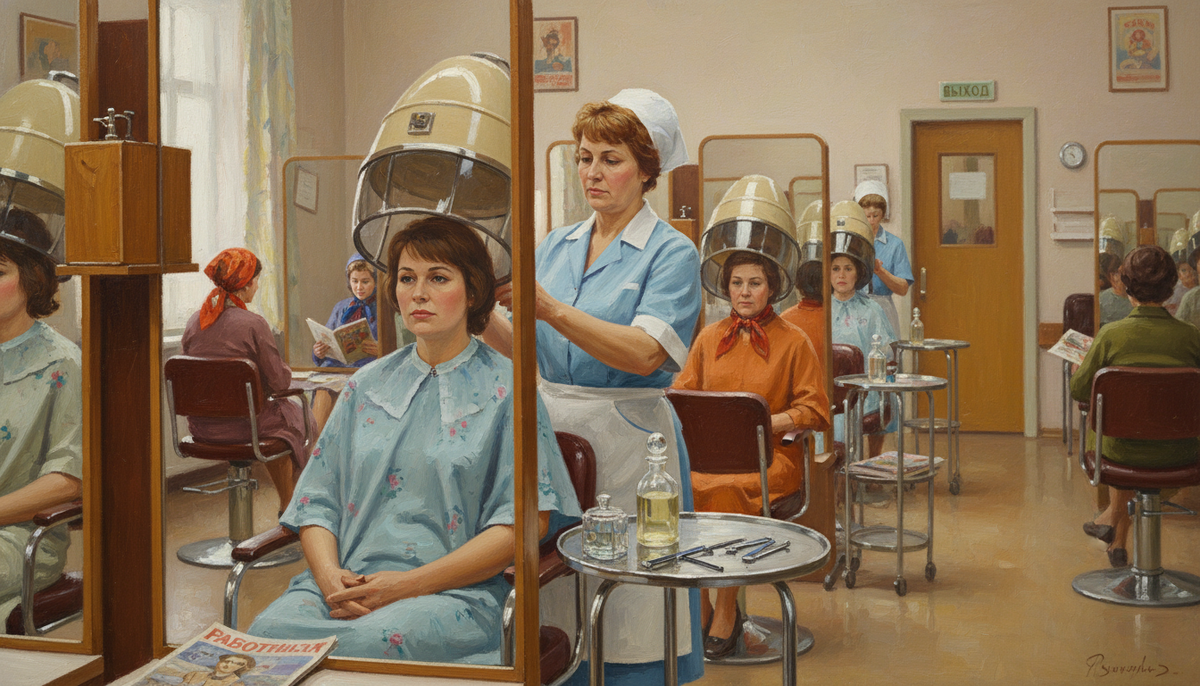 Снаружи — стандарт. Светлое помещение, трюмо с зеркалом, одинаковые кресла. В каждом городе страны, от Мурманска до Ташкента, интерьер был будто сделан под копирку. Государство устанавливало единый прейскурант, единый набор услуг, единые нормы. Стрижка — сорок копеек. Укладка — шестьдесят. Химическая завивка — по договорённости с мастером.