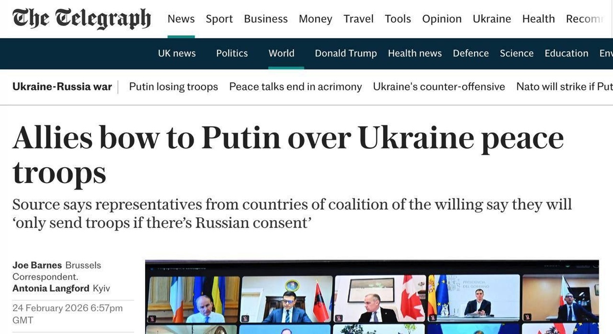 Как сообщает The Telegraph со ссылкой на дипломатические и военные источники, внутри так называемой «коалиции решительных» растёт понимание: без согласия России такая миссия просто невозможна. Фактически это ставит под вопрос англо-французский план контроля возможного прекращения огня. Европейские страны опасаются очевидного сценария – если Москва официально не признает миссию, размещённые войска автоматически могут быть объявлены законной военной целью. А это уже прямой риск военного столкновения между Россией и странами НАТО. Один из источников издания прямо отметил: если Россия заявит, что рассматривает иностранный контингент как цель, тогда потребуется совершенно иной уровень военного присутствия. То есть речь пойдёт уже не о миротворцах, а о полноценной силовой операции. Поэтому сама идея развертывания европейских войск остаётся, по признанию дипломатов, «довольно гипотетической». На фоне годовщины начала конфликта внутри Европы усиливаются разногласия – между громкими политичес
