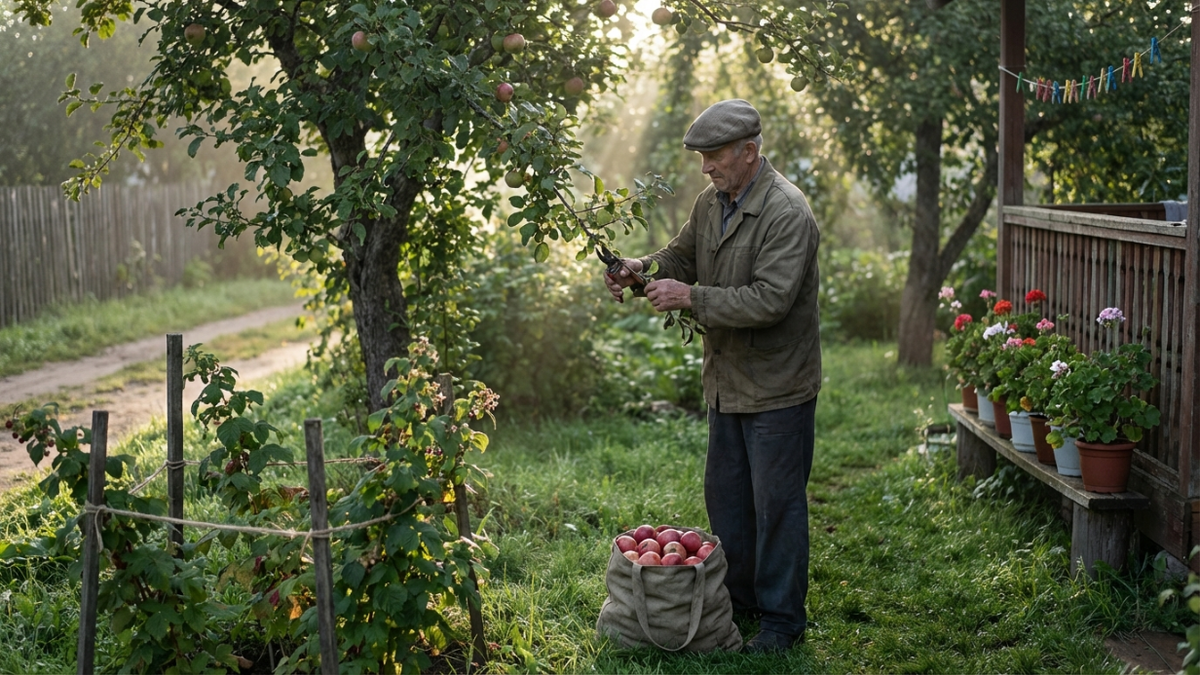 Пожилой мужчина в потёртой одежде осторожно пробирался между кустами малины. У него была окладистая седая борода и старая кепка. Он двигался неторопливо, как человек, которому некуда спешить. Подойдя к яблоне, он осмотрел её, потом достал из холщового мешка секатор и аккуратно срезал сухую ветку. Затем собрал несколько упавших яблок, положил их в мешок и так же тихо направился обратно к лазу в заборе.