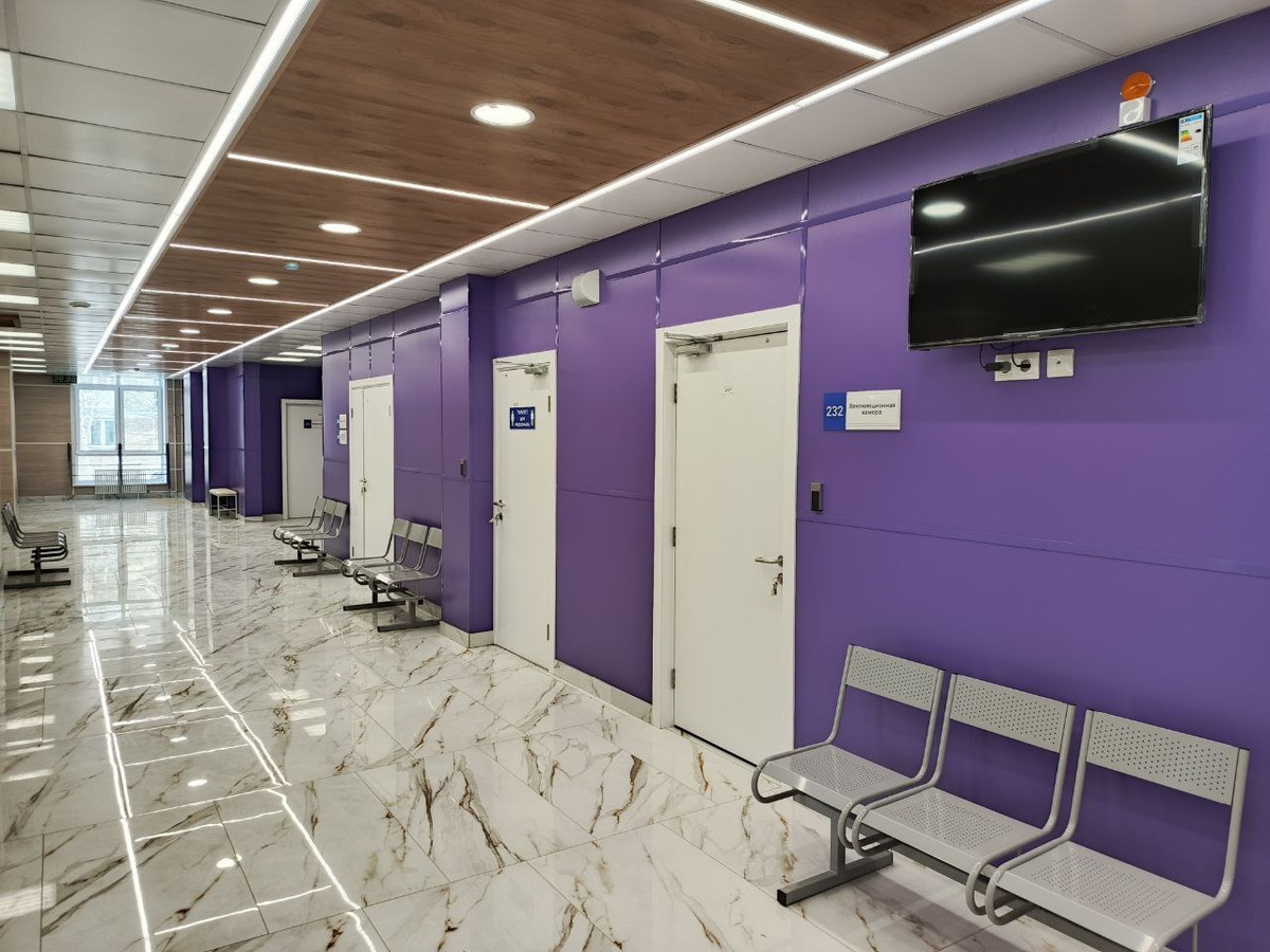 Я ещё и #яждизайнер На фото - поликлиника 5 в Новокузнецке, которая откроется в марте Интерьер довольно аккуратный и современно: глянцевый пол, белые двери, тёплый деревянный потолок. Однако всё пространство формирует густой холодный фиолетовый, и именно он задаёт эмоциональный фон. Сам по себе фиолетовый может выглядеть благородно и статусно, но здесь он слишком насыщенный и занимает большую площадь. В длинном коридоре плотный тёмный оттенок начинает визуально сжимать пространство и поглощать свет, создавая ощущение тяжести. Цвет не разбавлен промежуточными нейтральными тонами, которые могли бы смягчить восприятие и связать элементы между собой. Фиолетовый здесь довольно агрессивен. Напоминаю, это поликлиника - место, куда пациенты приходят в состоянии тревоги, усталости или физического дискомфорта. Пространство в таких местах должно работать на снижение напряжения. Густой холодный фиолетовый, напротив, усиливает ощущение строгости и серьёзности. Он не транслирует мягкость и безоп
