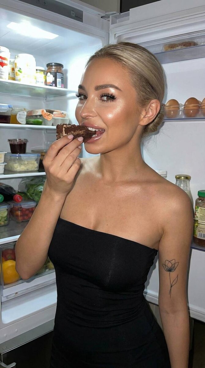 ) Модель: Nano Banana Сгенерировать🪄 Фото сделано ночью со вспышкой, создающим яркие контрасты и подчёркивающим детали. Девушка стоит у открытого холодильника. Она в чёрном платье по фигуре без бретелей, которое подчёркивает её силуэт и создаёт элегантный и нежный образ. В руках она держит кусок торта который собирается съесть, придавая лицу игривое выражение Волосы собраны в пучок Кожа подсвечена хайлайтером, который придаёт ей здоровое сияние, особенно на щеках и вдоль скул, а на щеках ещё виден хайлайтер, добавляя визуальной глубины и сияния. Ресницы накрашенные. На руке тату цветы чёрные минималистичные полупрозрачные , что придают её образу завершённость и утончённость. Губы в лёгком блеске, что дополняет свежесть её лица. Фото с высокой детализацией, подчеркивающее текстуры кожи, яркие акценты на световых играх и нежных элементах её образа, создавая атмосферу ночной элегантности и нежности. Холодильник заполнен едой