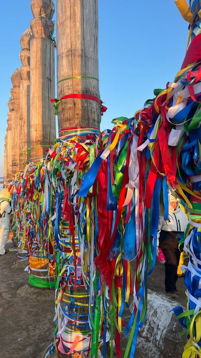 На мысе Бурхан острова Ольхон находятся 13 ритуальных столбов — сэргэ. Они возвышаются перед скалой Шаманка. Это сакральный символ, олицетворяющий культ предков и связь трех миров. Они посвящены 13 сыновьям верховного божества — нойонам . 🌳 СИМВОЛИКА: Каждый столб является воплощением Мирового древа: Нижний мир (прошлое): корни уходят в землю . Средний мир (настоящее): ствол — мир людей . Верхний мир (будущее): вершина устремлена к небесам, где обитают божества . У сэргэ было и практическое значение — как коновязь, указывающая на наличие хозяина . Три горизонтальные канавки на столбе предназначались для привязи коней 🎗️ ОБРЯДЫ: Столбы часто обвязаны цветными лоскутками ткани — это способ донести просьбу до богов. Ветер колышет ленты, и молитва «путешествует» . Важен цвет ленты: 🤍 Белый: благодарность духам, чистота помыслов, здоровье. 💙Синий: обращение к небесам и богам (универсальный цвет). 💚Зеленый: связь с природой, плодородие. ❤️Красный: семья, домашний очаг. 💛Же