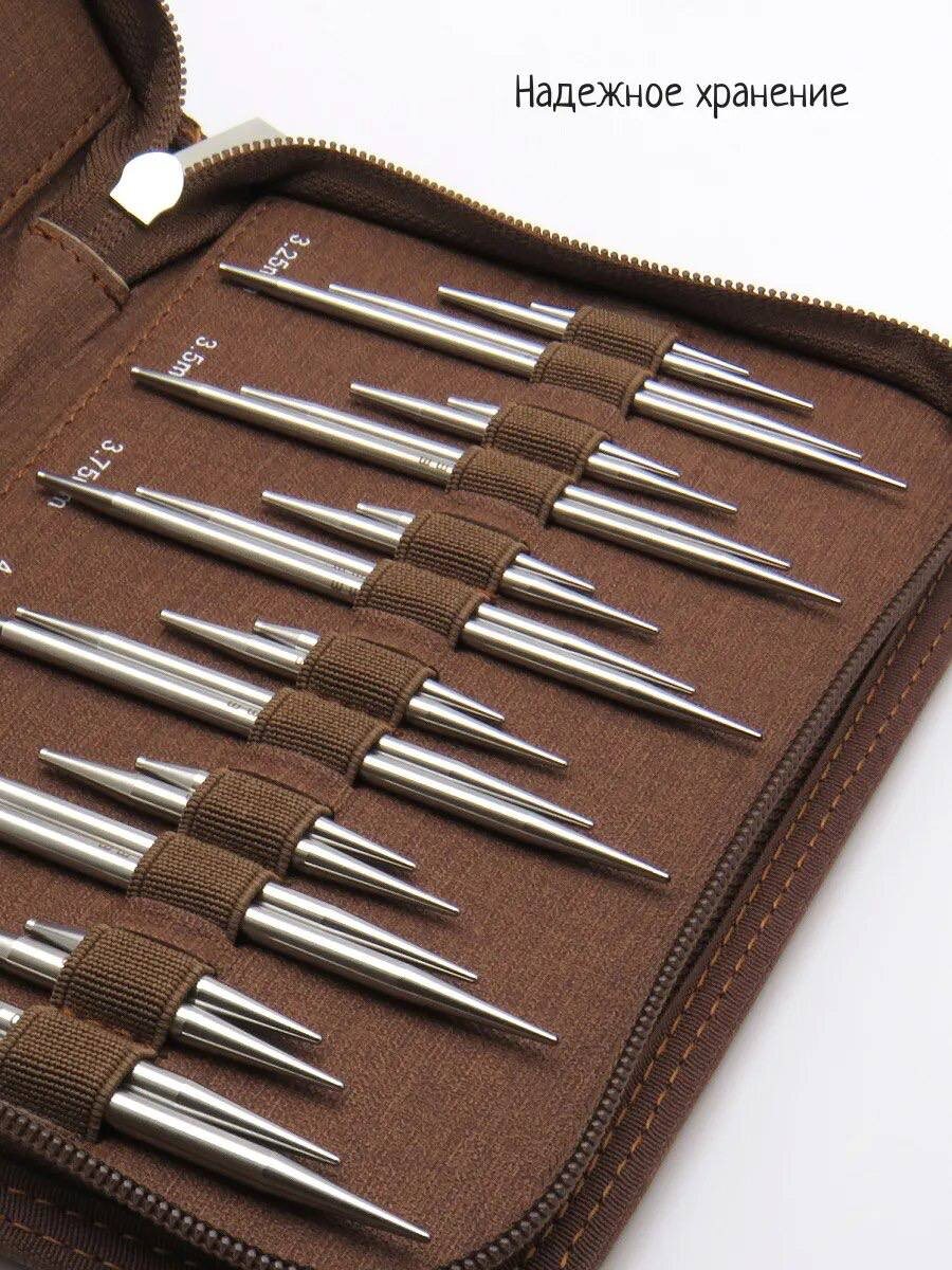 Что хотелось бы отметить: наборы там совершенно разные, но больше всего взгляд цепляется за наборы, в которых представлены 3 спицы одного номера или 4 спицы. Все три (или четыре) спицы идут разной длины. Кому-то это будет удобно, особенно потому что покупать дополнительные наборы не нужно, например для детских вещей или шапок. Эти спицы-конструктор очень универсальны. Перечислять все возможные наборы, которые есть у Вултор, я не буду. Маркетплейсы выдают мне варианты стальные и алюминиевые; также пишут, что стальные спицы достаточно тяжёлые, а алюминиевые — легче. Учитывайте этот момент, если вы вяжете долго и ваши руки устают. Тросики, как заявляет производитель, все поворотные, без эффекта памяти, вращаются вокруг своей оси. Обладатели данного набора говорят, что соединение тросика со спицей хорошее, нет никакой ступеньки и зазора. Также отмечают тот момент, что во время вязания спица может откручиваться от тросика, но это решается тем, что надо закрутить посильнее, чтобы избежать