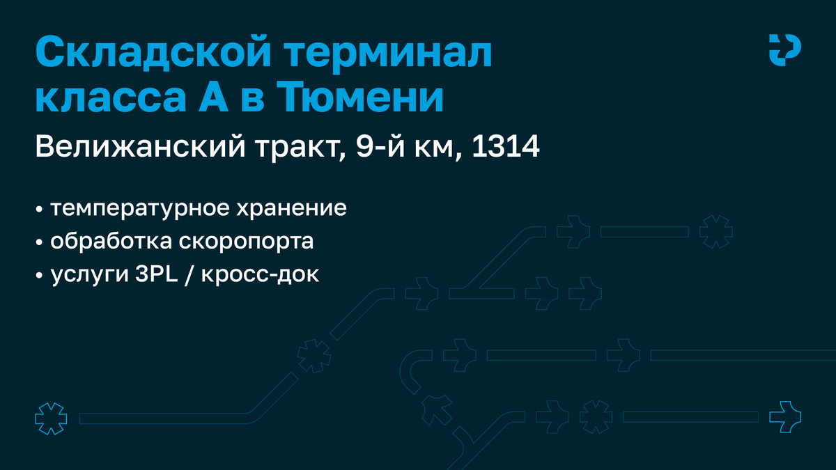 Продолжаем знакомить с нашей инфраструктурой. Складской терминал класса А в Тюмени по адресу Велижанский тракт, 9-й км, 1314 — удобная локация с быстрым выездом на ключевые магистрали. Это позволяет эффективно работать как по городу и области, так и по межрегиональным направлениям. Терминал общей площадью 4 100 м² работает в диапазоне +6…–18 °C. Он рассчитан на хранение и обработку охлаждённой и замороженной продукции: мясо, рыба, птица, полуфабрикаты, молочная продукция, мороженое, кондитерские изделия, овощи и ягоды, продукция в вакуумной упаковке. Хранение возможно как напольное, так и стеллажное — мы используем фронтальные и глубинные стеллажи. Приёмку, обработку и комплектацию заказов выполняем в зоне экспедиции и на мезонинах, что позволяет разделять потоки и ускорять подборку. Внутрискладская логистика организована с помощью ричтраков, штабелёров и электропогрузчиков — техника подбирается под формат партии и интенсивность операций. Работа терминала поддерживается учётными систе