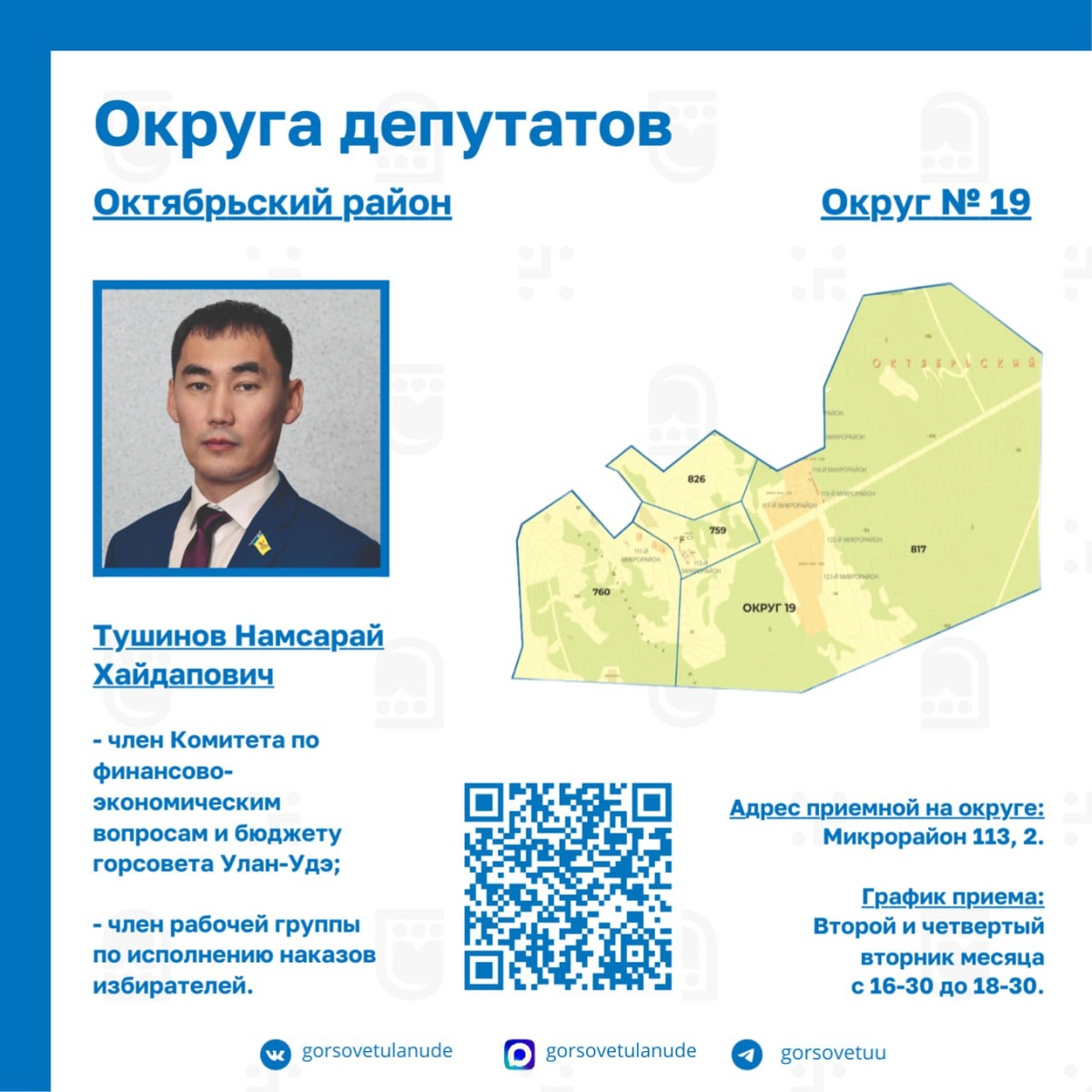 🔷Избирательный округ №19 🔹Округ №19 включает в себя юго-западную часть Октябрьского района, в частности квартала от 105-го до 130-го, кроме 110-го и 120-го кварталов. Здесь многоэтажные дома соседствуют с частной застройкой и лесными массивами, это один из активно развивающихся округов Улан-Удэ. 🔹Депутатом округа является Намсарай Хайдапович Тушинов, член Комитета по финансово-экономическим вопросам и бюджету Улан-Удэнского городского Совета депутатов, член рабочей группы по исполнению наказов избирателей. 🔹Сотые квартала застраиваются, частный сектор также развивается, для решения существующих и появляющихся проблем требуется все больше внимания и средств. В первую очередь это хорошие дороги, обновленная жилищно-коммунальная инфраструктура и соцобъекты. 📍Адрес приемной на округе: Микрорайон 113, 2. 🗓График приема Второй, четвертый вторник месяца с 16-30 до 18-30. 🔎 Подробнее о том, какие микрорайоны и улицы входят в состав округа №19 - в нашем канале в MAX 👇 https://max.