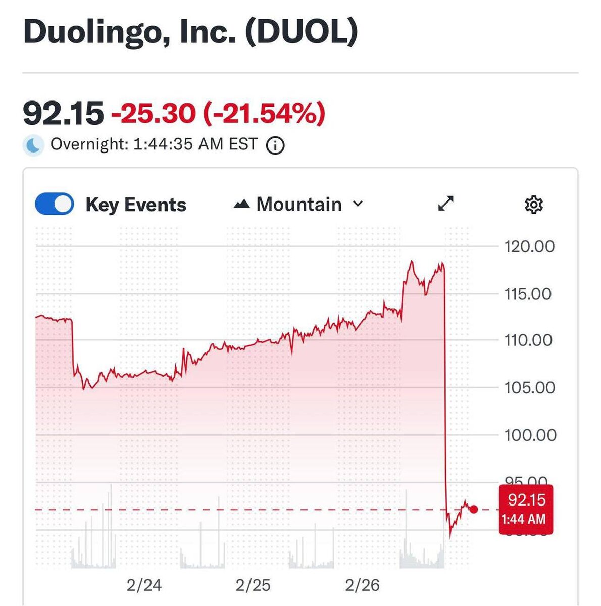 После публикации прогноза на 2026 год акции Duolingo снизились на 22,9% после закрытия торгов. За последний год стоимость акций компании упала с $520 до $117, что составляет почти 70%. https://dzen.ru/id/5c0e38ff46ef5c00aaa80527
