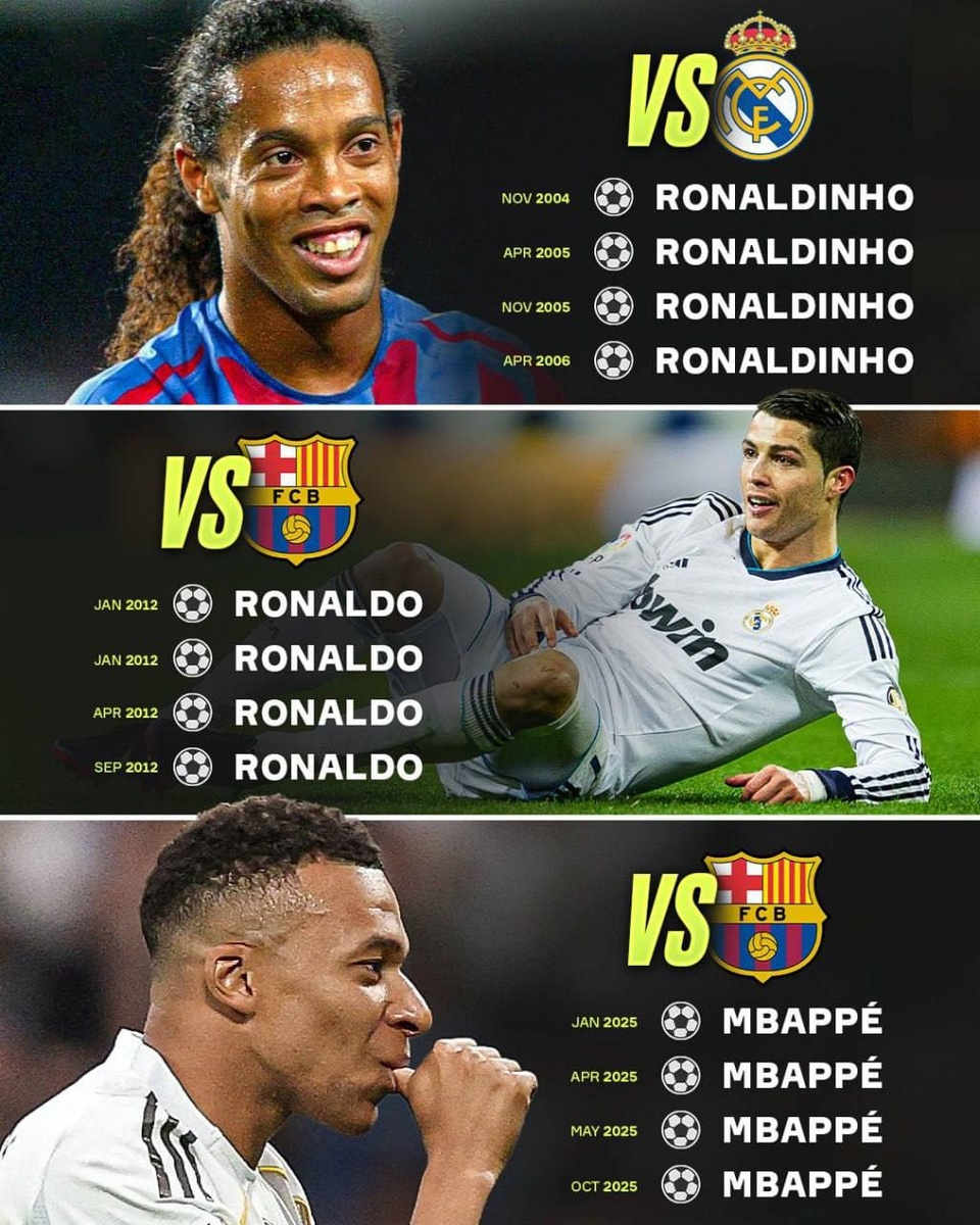 Лишь 3 игрока в истории забивали в четырёх «Класико» подряд: Роналдиньо, Роналду и Мбаппе