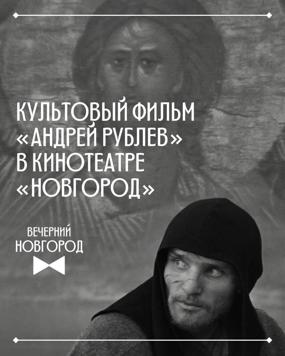 28 февраля эксклюзивно в кинотеатре «Новгород» — отреставрированная версия легендарной картины Андрей Рублев режиссёра Андрей Тарковский. Фильм, ставший одной из вершин мирового кинематографа, вновь можно будет увидеть так, как он задумывался автором — на большом экране, в обновлённом качестве изображения и звука. «Если режиссер говорит, что сделает проходную картину, чтобы потом снять ту, о которой мечтает, — это самообман. Он никогда уже не снимет своего фильма», — Андрей Тарковский. Редкая возможность увидеть культовую ленту в кинозале и заново пережить ее мощь, тишину и внутренний свет. 🗓 28 февраля, 18:00 📌 Кинотеатр «Новгород» ✔️ Билеты: 400 ₽ — взрослые, 300 ₽ — студенты 🖥 Билеты здесь
