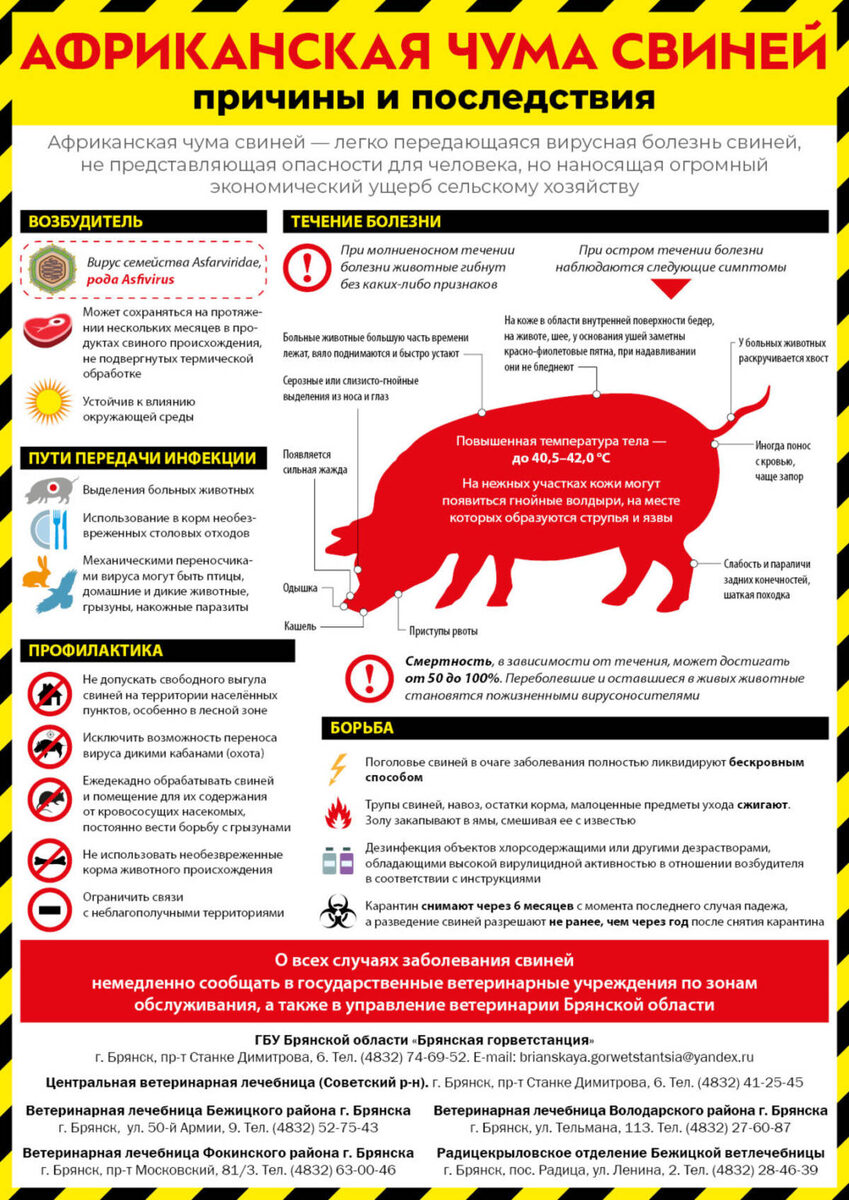 На фоне напряженной эпизоотической ситуации по африканской чуме свиней (АЧС) в ряде регионов России, включая Брянскую область, городское управление ветеринарии обратилось к жителям с рекомендациями по профилактике опасного заболевания. В ведомстве подчеркнули, что вирус несет серьезную угрозу для личных подсобных хозяйств и свиноводческой отрасли в целом. Африканская чума свиней (также известная как болезнь Монтгомери) отличается высокой летальностью. При остром течении заболевания смертность среди поголовья достигает 100%, что наносит значительный экономический урон. Убытки складываются не только из гибели животных, но и из затрат на карантинные мероприятия, уничтожение поголовья в очагах инфекции, а также ограничений на торговлю продукцией животноводства. В управлении отметили, что для человека вирус АЧС опасности не представляет. Употребление в пищу мясных продуктов, прошедших тщательную термическую обработку (при температуре выше 70 градусов), безопасно для здоровья. Однако специал