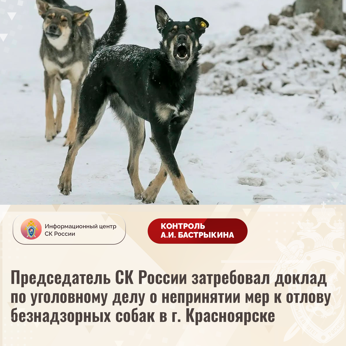 Председатель СК России затребовал доклад по уголовному делу о непринятии мер к отлову безнадзорных собак в г. Красноярске В Информационный центр СК России поступило обращение по вопросу нарушения прав жителей Железнодорожного района города Красноярска. Длительное время вблизи жилых домов и трансформаторной подстанции располагается несанкционированный приют для бездомных собак. Агрессивные животные систематически нападают на местных жителей. Обращения граждан в уполномоченные органы результатов не принесли. В ГСУ СК России по Красноярскому краю и Республике Хакасии возбуждено уголовное дело. Председатель Следственного комитета Российской Федерации Александр Иванович Бастрыкин затребовал у руководителя ГСУ СК России по Красноярскому краю и Республике Хакасии Алексея Леонидовича Еремина доклад о ходе и результатах расследования уголовного дела. Исполнение поручения поставлено на контроль в центральном аппарате ведомства. #СледственныйКомитет #СКРоссии #СКР #ИЦСКР #ИнформационныйЦентр #Але