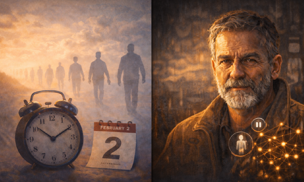 Сначала герой Билла Мюррея делает ровно то, что делает большинство людей и без всякой петли: он живёт рассудком — комментирует, использует, манипулирует, экономит себя. Потом петля ломает его иллюзию контроля. И только после этого начинается настоящее: он учится жить в дне, а не “проскальзывать” его.