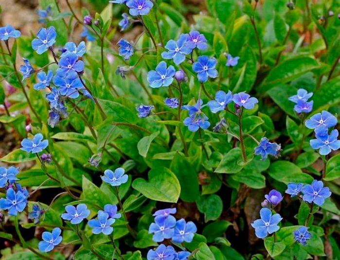 Пупочник весенний (Omphalodes verna): Это, пожалуй, самый известный и любимый вид. Он образует рыхлые