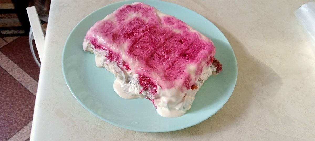 продолжение 4️⃣ Убрать форму в холодильник на 1 час. 5️⃣ Накрыть блюдом для подачи, перевернуть салат, снять форму и плёнку. 6️⃣ Украсить верх оставшейся «икрой». 🌷 Имитация чёрной икры (5 порций) • 2 ст. л. семян чиа (≈50 г) • 90 мл воды • 2 листа нори или упаковка чипсов нори • 0,5 ч. л. соли • 1–2 ст. л. растительного масла (льняного или подсолнечного) Приготовление: - Чиа залить тёплой водой и оставить на 30 минут, периодически перемешивая. - Нори измельчить в кофемолке. - В набухшие семена добавить соль и масло, перемешать. - Добавить порошок нори и снова перемешать. - Накрыть плёнкой и оставить на 1 час (или на ночь) для стабилизации вкуса. 🥄 Хранить в герметичной ёмкости в холодильнике до 1 суток. 🌷 Домашний сметанный майонез • 500 мл сметаны • 0,5 ч. л. чёрной соли • 0,5 ч. л. обычной соли • 1 ст. л. сахара • 0,5 ч. л. куркумы • 1 ч. л. горчицы • щепотка асафетиды • 3 ст. л. растительного масла