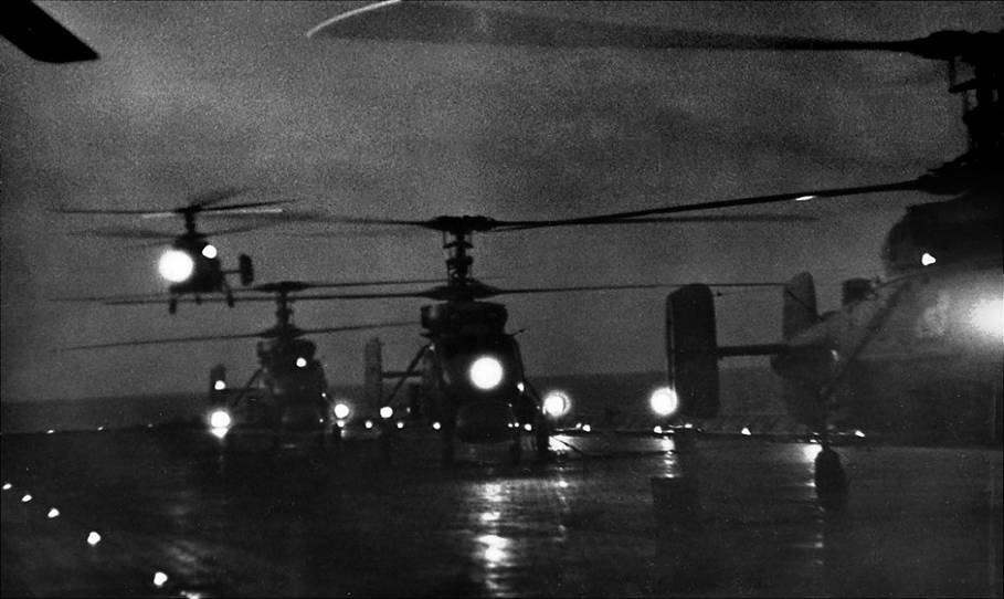 Средиземное море. Отряд боевых кораблей Северного флота во главе с тяжелым авианесущим крейсером «Киев» отрабатывает ночные полёты палубных вертолётов по плану боевой службы.