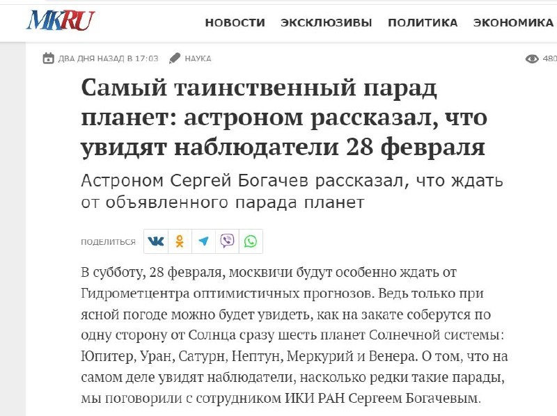 Что, на самом деле, мы сможем увидеть. Вновь в СМИ пошла волна комментариев "Экспертов" на астрономическую тему. Самое обидное -в этой вакханалии цитируют комментарии профессиональных астрономов... Обещают, что мы увидим 6 планет, да еще и "почти" на одной линии. Что же мы сможем увидеть на самом деле? Если коротко, то - только Сатурн и Юпитер. Но мы их и так видим на Небе весь год. Поясню на примере Симферополя. Солнце заходит в 18:29. Сумерки ( навигационные) заканчиваются в 19:33. В момент захода Солнца Венера находится над горизонтом на высоте менее 10 градусов, и будет теряться в лучах Солнца. То-же касается Меркурия. 19:00. Высота Венеры: 5 гр, Меркурия: 6, небо еще светлое, а блеск планет силно уменьшен атмосферой. 19:26 - заход Венеры за горизонт, Меркурий -следом. Именно с 19 по 19:20 опытный наблюдатель, при идеальном небе и чистом горизонте сможет найти три планеты. Но, увы, идеальные условия крайне редко бывают... Далее - заходящий Сатурн и Юпитер...