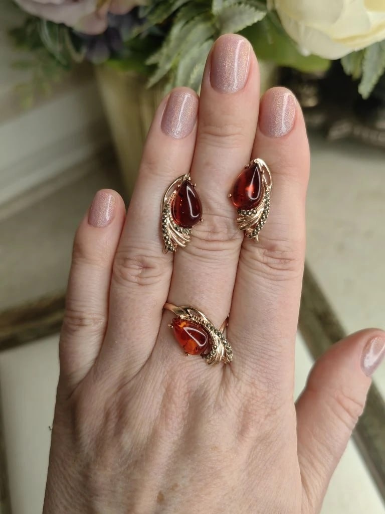 Серебро 925 проба , позолота 18 карат, натуральный янтарь, марказиты.