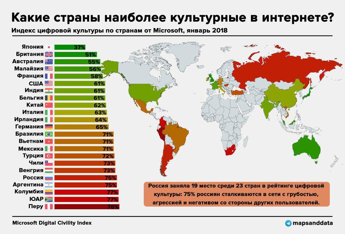 В 2018 году Microsoft опубликовала индекс цифровой культуры по 23 странам, который косвенно свидетельствует, что в России одна из самых недружелюбных аудитория пользователей. У меня нет ответа на вопрос, чем это можно объяснить, потому что в целом у нас спокойный народ в живом общении, хотя может быть чересчур настороженный. Но, что я точно знаю, так это необходимость отгораживать себя от всего этого негатива, а порой и откровенного бреда. Не обязательно это делать в прямом смысле через бан, достаточно просто пропускать мимо (однако, есть случае, когда точно стоит сразу или почти сразу отправить в бан). Татьяна Черниговская, профеcсор СПбГУ, доктор филологии и биологии отлично выразилась на сей счёт: "Нельзя читать глупые книги, общаться с придурками и слушать плохую музыку – все это остается в вашем мозгу". А значит, если в нем накопится много подобного "отвара", то не ровен час получить вполне закономерные психические расстройства.