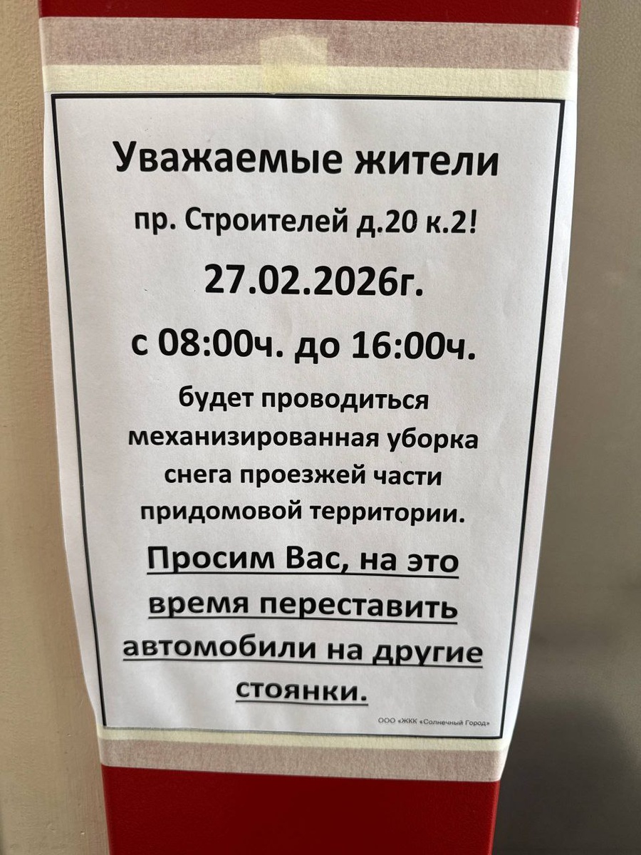 Просьба автовладельцев убрать машины, очень мешают чистке. Заранее благодарю.