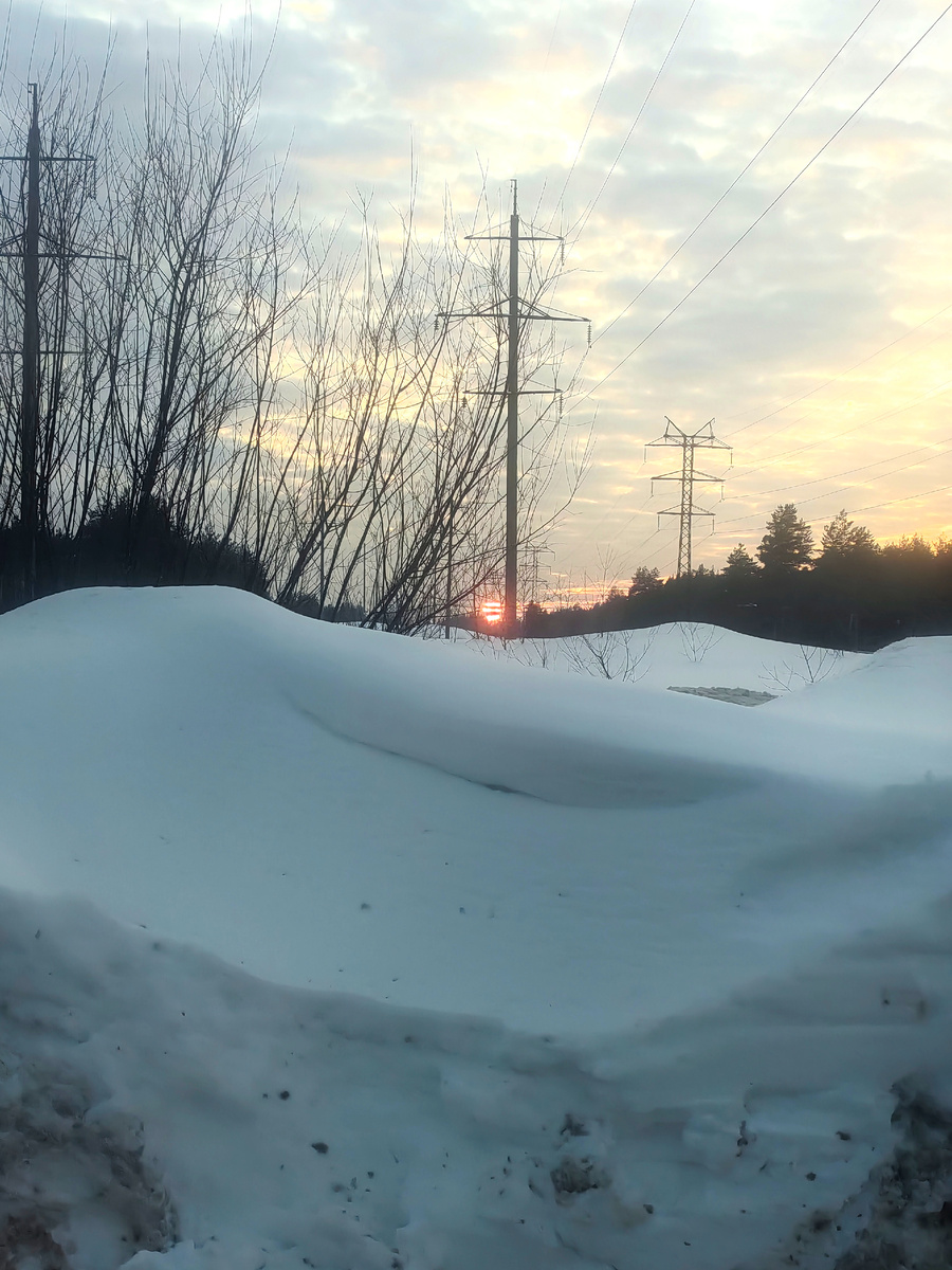 На остановке она одна. Кругом большие сугробы.