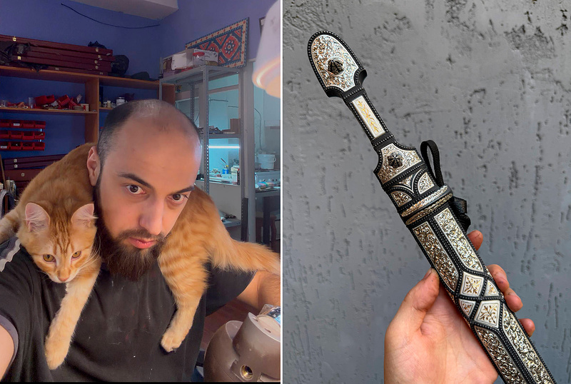 Год назад, возвращаясь вечером домой, Дауд Куртаев посреди дороги нашел крошечного котенка. Решение оставить его себе Дауд считает одним из лучших: с тех пор монотонная рутина оружейника в пятом поколении заиграла новыми, рыжими красками. Мастерская Дауда находится в Махачкале, но сам он родом из знаменитого села Кубачи. Дауд — единственный сын в семье. Интерес к ювелирному делу появился у него уже в детстве. Как и многие кубачинские мальчишки, едва освоив азбуку, Дауд учился аккуратно выводить традиционные орнаменты в специальных тетрадях, похожих на прописи. В десять лет он впервые взял в руки стальной резец — штихель и начал оттачивать мастерство на медной пластине. Уже через несколько лет самостоятельно изготовил свою первую цепочку в технике «Бисмарк». — Орнамент — это база для каждого кубачинца, даже если он потом не станет ювелиром, — объясняет Дауд. После школы он все же не решился сразу связать жизнь с искусством и поступил на факультет экологии Дагестанского государственного