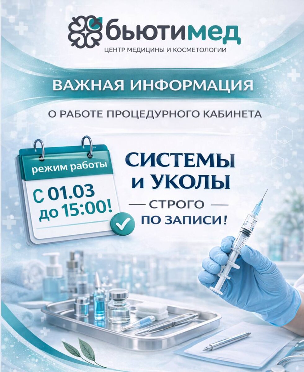 ! С 1 марта 2026 года процедурный кабинет будет работать до 15:00. Системы, инъекции проводятся строго по предварительной записи. Приносим извинения за возможные неудобства — это временные меры. 📍 Ульяновск, ул. Карбышева, 30 📞 Запись: 50-53-23 📞 +7 (8422) 50-53-23 МАКС +79272706126 или через наш сайт 🌐 Берегите здоровье — подарите себе спокойствие и уверенность ❤️ Имеются противопоказания. Необходима консультация специалиста. #БьютиМед #Гастроэнтеролог #анализы #Ульяновск #здоровье #косметологульяновск #неврологульяновск #губыульяновск #дерматологульяновск
