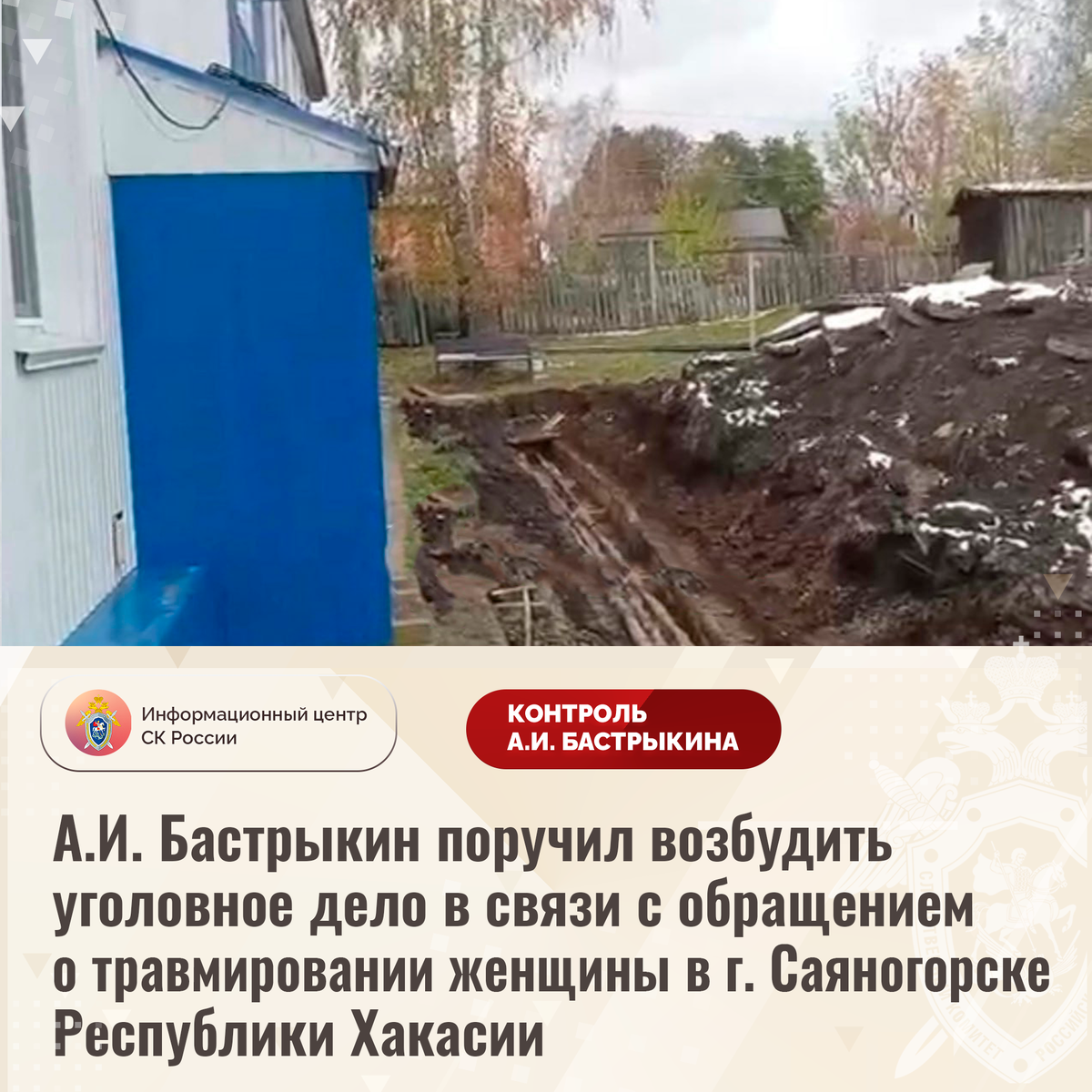 А.И. Бастрыкин поручил возбудить уголовное дело в связи с обращением о травмировании женщины в г. Саяногорске Республики Хакасии В комментариях в аккаунте приёмной Председателя СК России А.И. Бастрыкина в социальной сети «ВКонтакте» поступило обращение в интересах жительницы рабочего поселка Майна города Саяногорска. В октябре прошлого года при выходе из подъезда дома женщина упала в неогороженную траншею, образовавшуюся в ходе проведения капитального ремонта тепло- и водопроводных сетей. Пострадавшую госпитализировали, ей требуется реабилитация. До настоящего времени никто к ответственности не привлечен. В ГСУ СК России по Красноярскому краю и Республике Хакасии проводилась процессуальная проверка, по результатам которой в возбуждении уголовного дела отказано. Председатель Следственного комитета Российской Федерации Александр Иванович Бастрыкин поручил руководителю ГСУ СК России по Красноярскому краю и Республике Хакасии Алексею Леонидовичу Еремину возбудить уголовное дело и представи