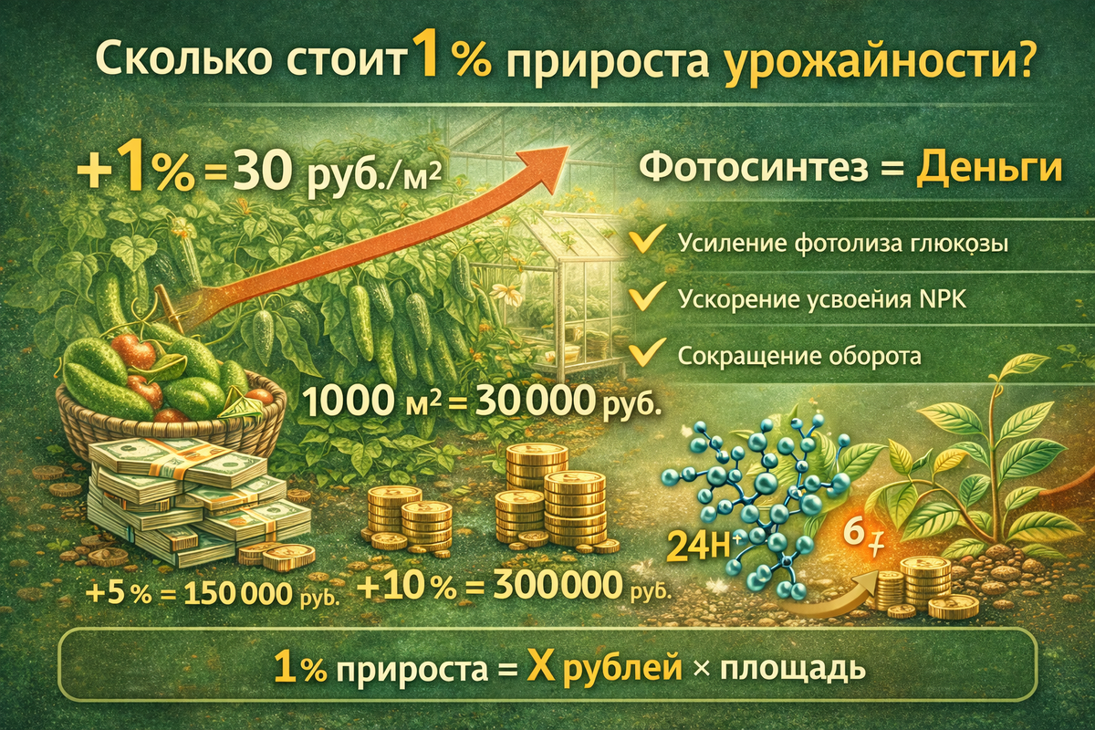 0,25 кг × 120 руб. = 30 руб./м² То есть: 👉 каждый 1% прироста урожайности = 30 рублей с 1 м² Если теплица 1000 м²: 30 руб. × 1000 = 30 000 руб. за каждый 1% 5% = 150 000 руб. дополнительной выручки. 10% = 300 000 руб. И это без расширения площади, без дополнительной аренды, без увеличения штата. Напомним: .Чтобы си