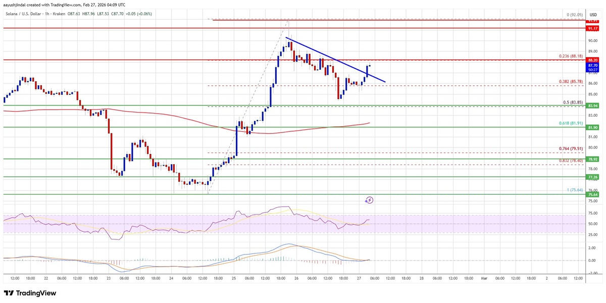 Цена: выше $85 📈 Solana стабилизируется выше отметки $85 после прорыва уровня $82, демонстрируя уверенный рост на фоне позитивной динамики Bitcoin и Ethereum. Прорыв выше медвежьей линии тренда на $87 на часовом графике SOL/USD указывает на дальнейший потенциал роста. Сейчас консолидация происходит выше $85, и цена нацелена на преодоление ключевых уровней сопротивления. 📊 Ключевые моменты: - Пробой линии сопротивления на $87. - Текущая торговля выше $85 и 100-часовой простой скользящей средней. - Уровни сопротивления: $88, $92, основной $95, далее $100 и $106. - Уровни поддержки: $85.50, $84 (50% Фибоначчи), $82, $78. - MACD и RSI указывают на бычий тренд. ⚠️ Риски: Неспособность пробить $88 может привести к коррекции. Горизонт: краткосрочный