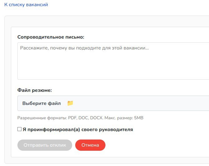 Для портала биотехнологической компании «Петровакс» (Москва) разработан и внедрён новый функционал публикации вакансий с возможностью отклика. Для внутренних кандидатов на портале реализована форма, которая открывается при нажатии на кнопку «Откликнуться» и позволяет заполнить необходимые детали. Решение упростит закрытие позиций за счёт внутренних сотрудников, повысит их вовлечённость и снизит затраты на внешний подбор персонала.
