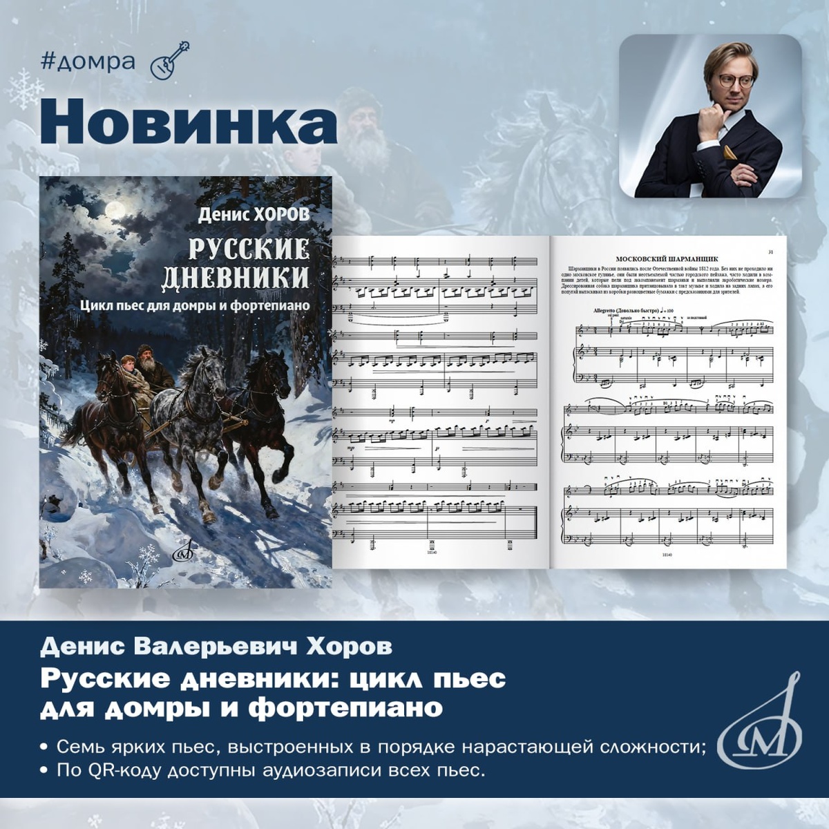 В. Хоров. Цикл пьес для домры и фортепиано «Русские дневники» Рассказываем о новейшем пополнении домрового репертуара! 🤩Расширять нотную библиотеку для русских народных инструментов — одна из важнейших задач «Музыки», и особенно приятно, когда появляется возможность представить новое оригинальное издание. «Русские дневники» Дениса Хорова как раз дарят нам такую возможность! «Русские дневники» — это цикл программных пьес для домры и фортепиано, образы которых навеяны русскими пейзажами и многонациональным колоритом России. 🤩В цикл вошли семь пьес: «Колыбельная Ладоги», «Дацан», «Фонтан “Трильби”», «Сияние», «Новгородский торг», «Московский шарманщик», «Лезгинка». Пьесы прокомментированы композитором в небольших предисловиях к каждой из них. Для удобства педагогов миниатюры размещены в порядке нарастания сложности, что может помочь при выборе репертуара для ученика. Цикл рассчитан на самый широкий круг учащихся ДМШ, ДШИ и младших курсов музыкальных колледжей. Также в помощь всем буд
