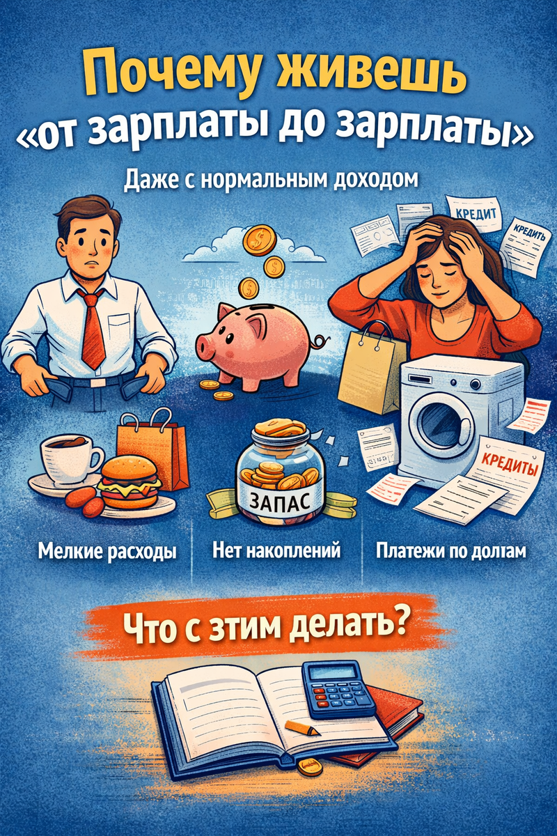 Есть распространённый миф: если человек мало зарабатывает — у него нет денег. На практике всё сложнее. Очень часто живут «в ноль» не те, кто мало получает, а те, кто не управляет потоком денег. Разберёмся по-честному. Проблема не в доходе, а в системе Представим двух людей. Один зарабатывает 45 000 ₽. Другой — 120 000 ₽. Угадайте, у кого чаще нет денег к концу месяца? Правильный ответ: у обоих. Потому что без системы деньги расходуются автоматически. 1. Расходы растут вместе с доходом Это называется «инфляция образа жизни». Зарабатывал 50 000 ₽ — снимал простую квартиру. Стал зарабатывать 90 000 ₽ — снял лучше. Появились: подписки такси вместо автобуса кафе вместо готовки «маленькие радости» Доход вырос. Свободных денег — нет. 2. Люди не считают мелкие траты Кажется, что: кофе — мелочь доставка — мелочь подписка — копейки Но 3–5 тысяч в месяц «на ерунду» — это 36–60 тысяч в год. А потом человек говорит: «Не могу накопить даже 20 000 ₽». 3. Нет финансовой подушки Любая внеплановая ситуа
