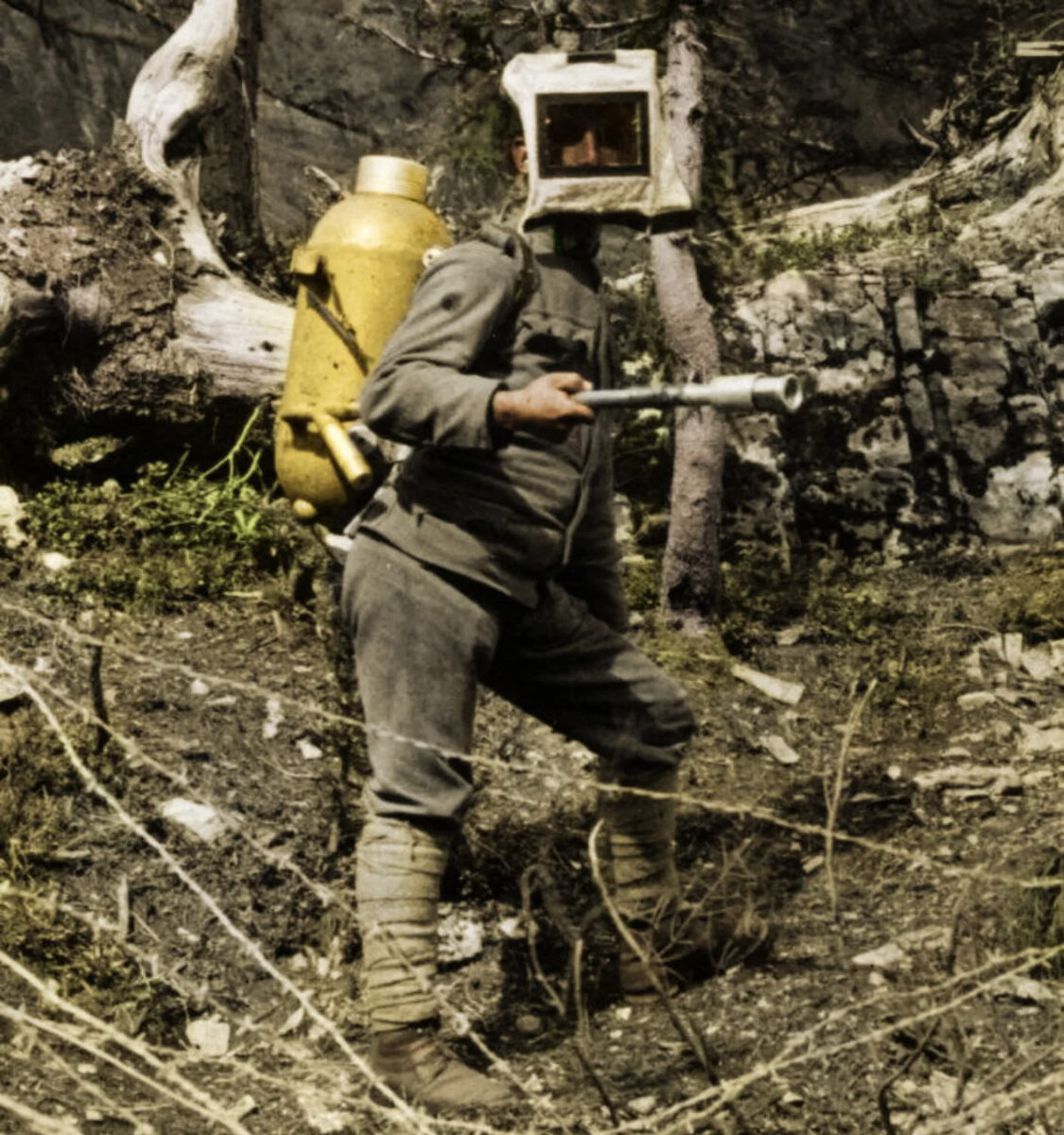 Австро-венгерский солдат в асбестовой маске с небольшим огнеметом М1912 на Итальянском фронте, около 1916 года.