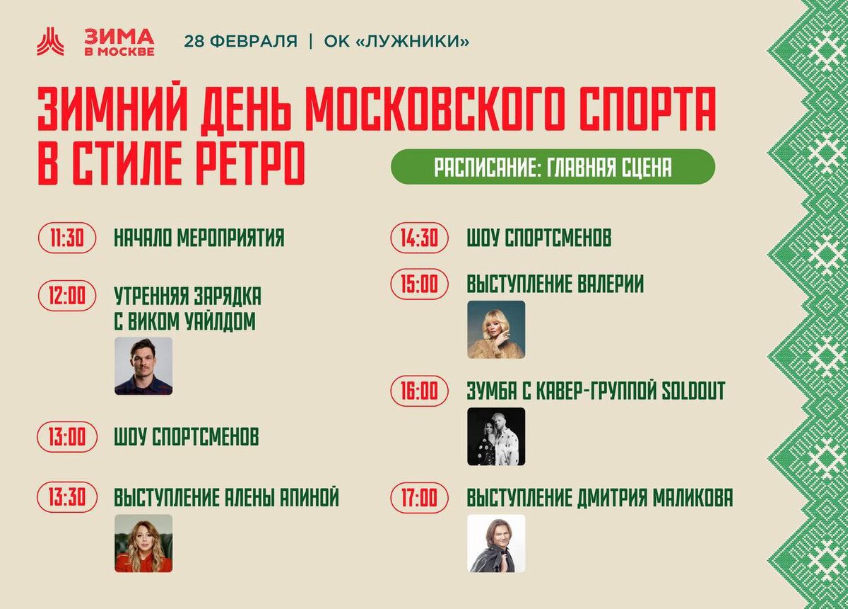 🗓️28 февраля 📍СК Лужники Зимний день Московского спорта в стиле ретро в «Лужниках» — это не только веселые активности, каток и лыжи. Это еще и сцена, на которой весь день будет жарко, даже если на градуснике минус! 🆓Бесплатно Подробнее ЗДЕСЬ @togetherwithkids Пост носит информационный характер Поддержать канал голосом ЗДЕСЬ 📲 Подписаться в МАХ