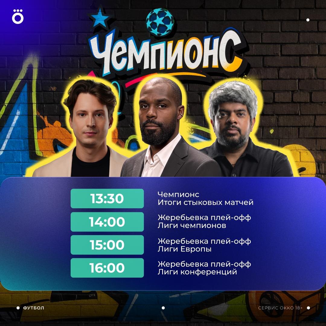 Время жеребьёвки 🏆 Денис Алхазов, Брайан Идову и Васант Балант подведут итоги стыков за полчаса до церемонии. А сразу после – обсудят и результаты жеребьёвки. 😀 Включай «Чемпионс» в 13:30 в Okko: https://okko.tv/s/xxa