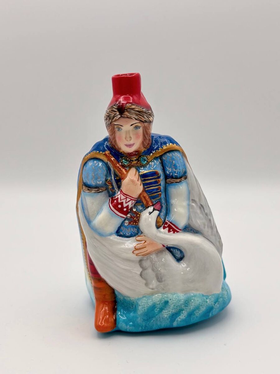 … ✨ Конец февраля стоит особенно тихий. Свет уже иной — мягче, прозрачнее, будто весна робко касается окон, но зима ещё не отпускает своих владений. И в эту светлую пору на нашем сайте появилась новинка — князь Гвидон и Царевна-Лебедь Яхонтовые 🕊️👑 Это продолжение целой серии, исполненной в едином, благородном стиле. Рядом со стоящим князем Гвидоном и Бабарихой теперь возникает трепетная сцена спасения — тот самый миг из «Сказки о царе Салтане», когда юный князь склоняется к белоснежной птице. В этом наклоне — мягкость, благородство и едва уловимое смущение. Посмотрите на его лицо — спокойный взгляд, чуть склонённая голова, осторожный жест руки, касающийся края перьев 🤍 Лебедь доверчиво прижимается к нему. Всё в композиции — тишина перед чудом, дыхание моря, ожидание преображения 🌊 В основании — волна. Голубая, прозрачная, живая. Она связывает образ со стихией, из которой родилась сказка, и придаёт лёгкую динамику, словно ещё слышится шум прибоя… 🌊✨ Костюм князя написан с осо